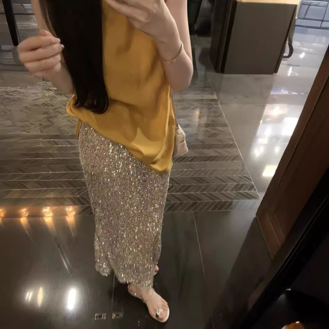 | nameOriginal | Summer Round Neck Sleeveless Shirt Retro Chic Small Shirt Women's Design Sense Backless Kink Vest Sequin Long Dress suit |