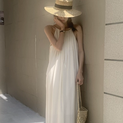 | nameOriginal | Summer Sanya seaside vacation beach skirt travel wear revealing collarbone loose backless long suspender dress for women |