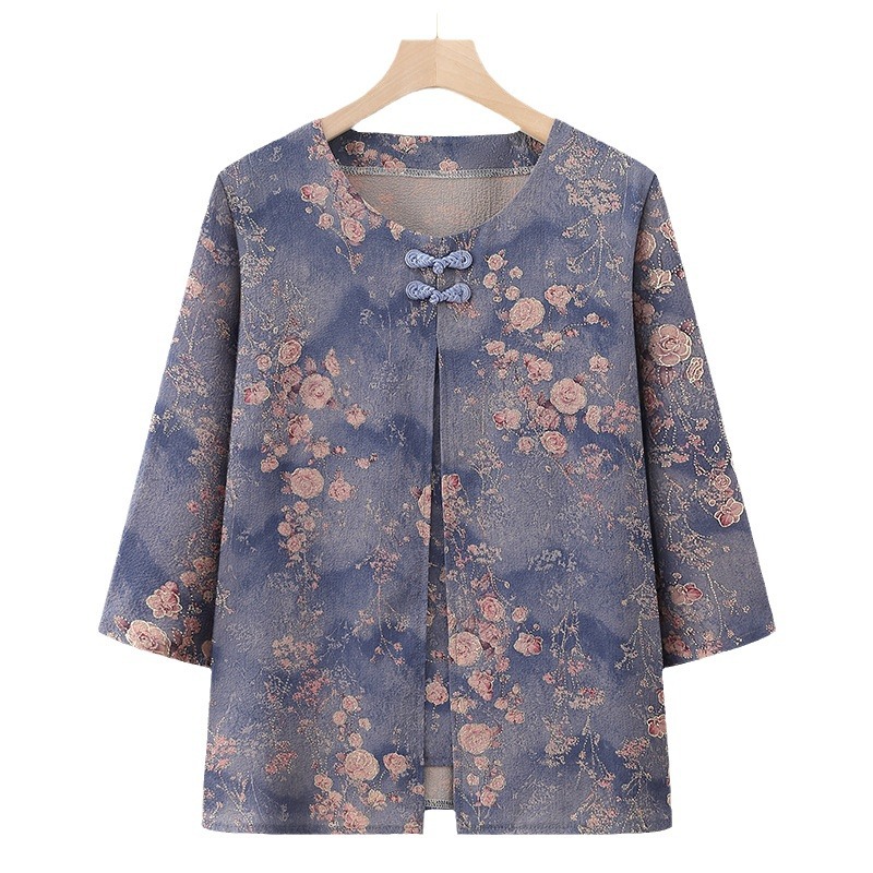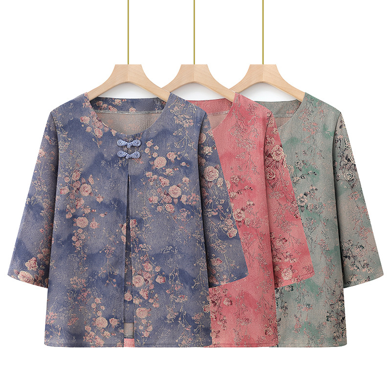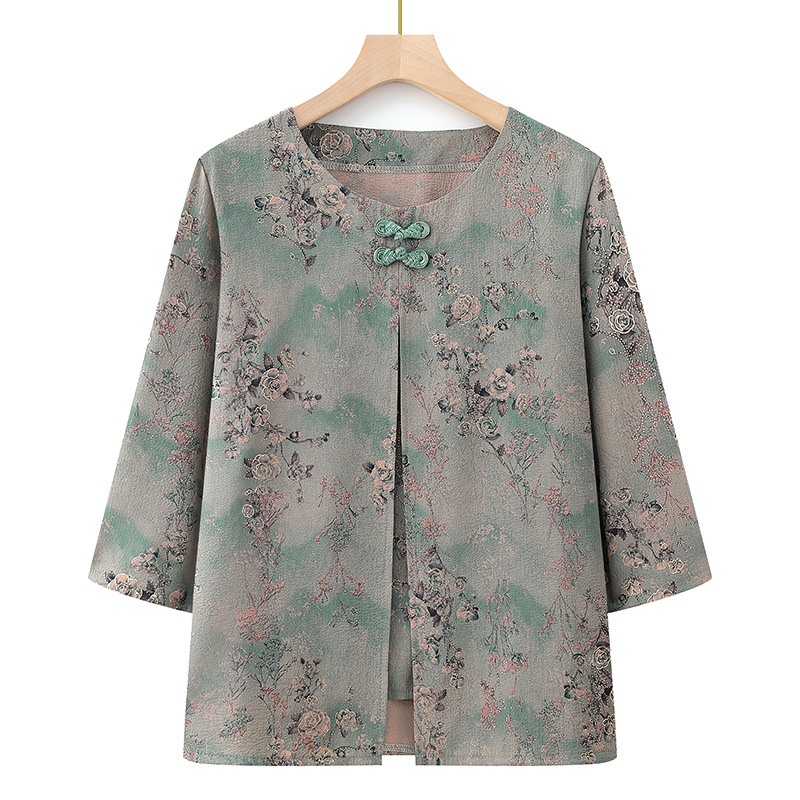 | nameOriginal | Summer Seven-Sleeve Chiffon Shirt Women's Top Mother-in-Law Retro Buckle Printed Fake Two-Piece Round Neck Pullover |