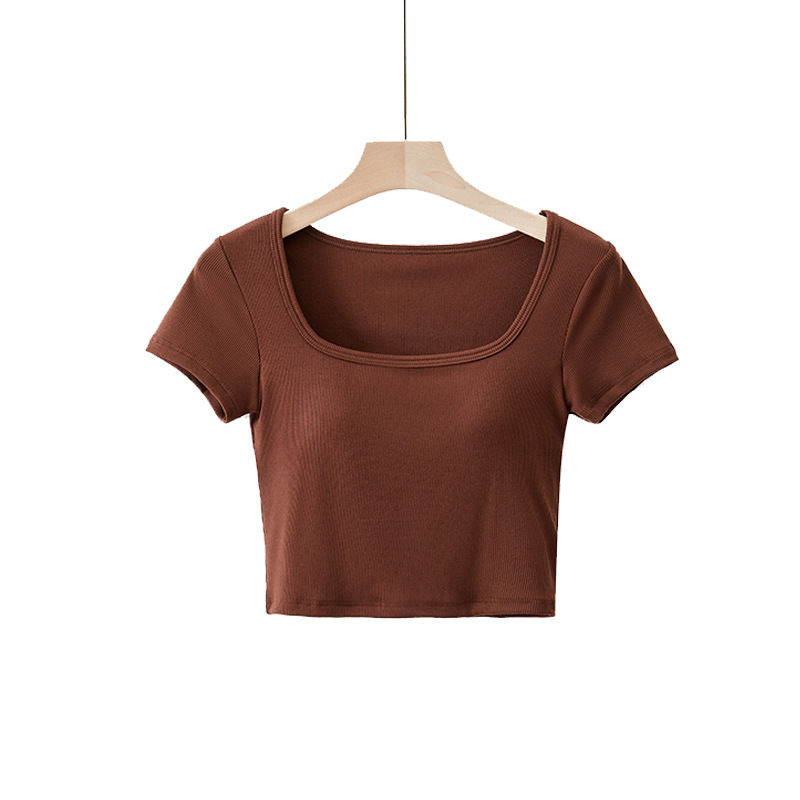 Summer Short Integrated Navel Square Collar Short Sleeve Cup Base Shirt with Chest Pad Casual Sports Women's Inner T-shirt