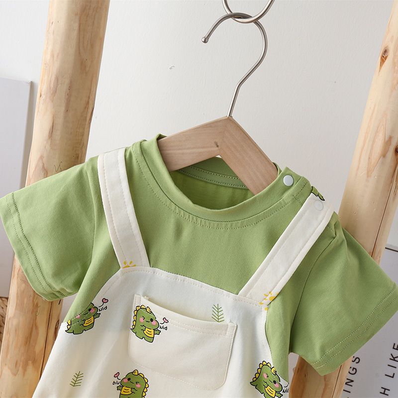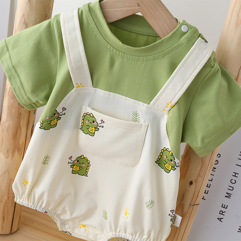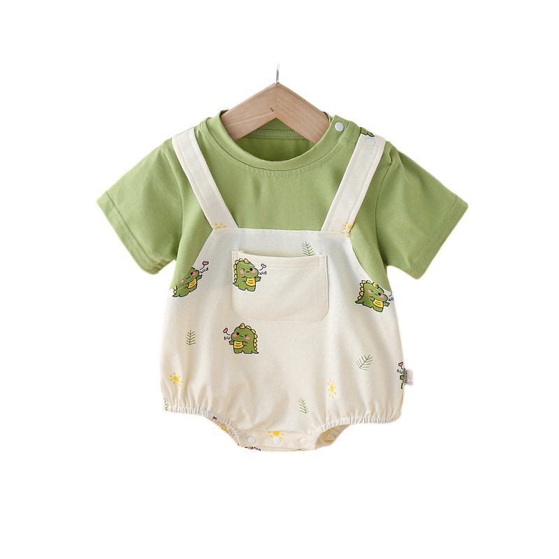 | nameOriginal | Summer Short-sleeved Hatshirt Triangle Bag Fart Clothes Cartoon Dinosaur Short Climbing Suit Baby Fake Two-piece One-piece Suit |