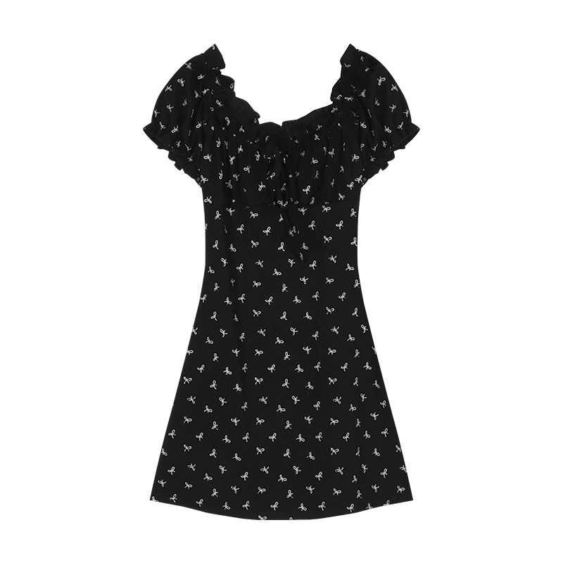 | nameOriginal | Summer short-sleeved one-shoulder dress with black bow |