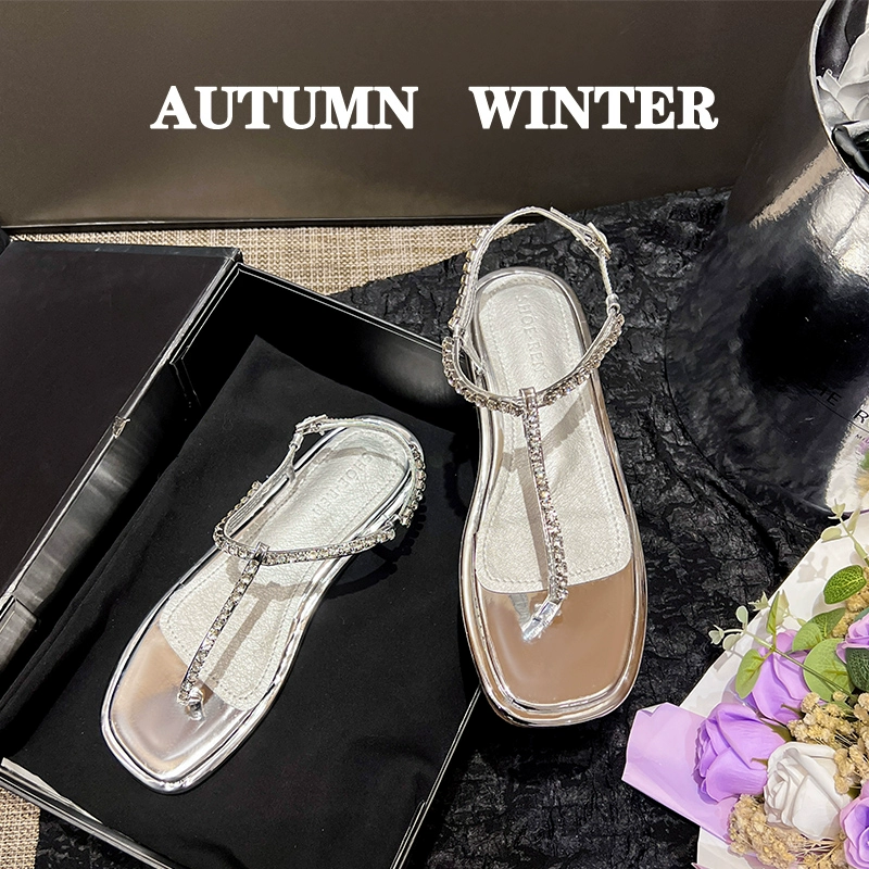 Summer silver sandals fairy style flat flip-flops with rhinestones