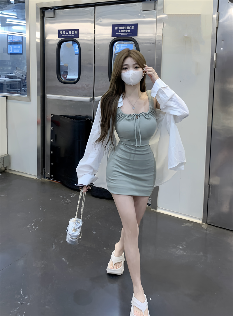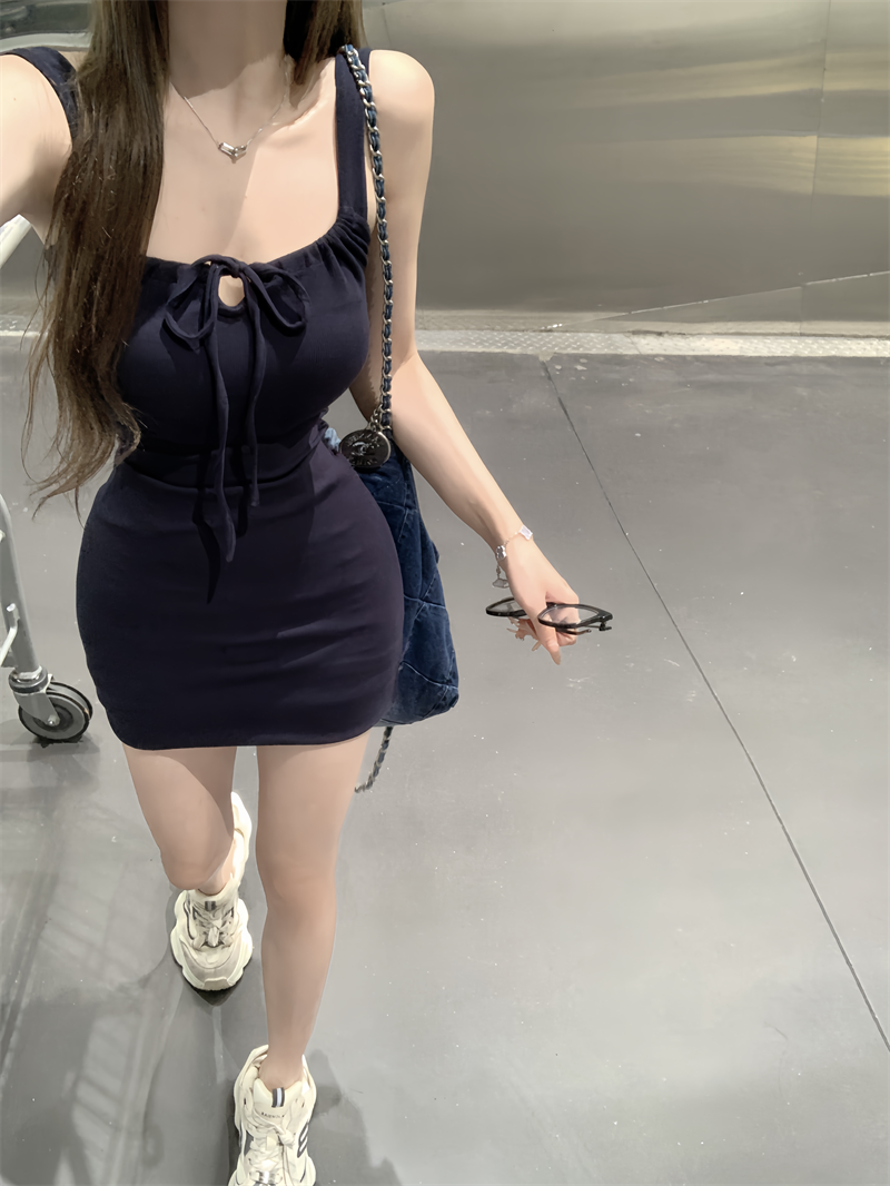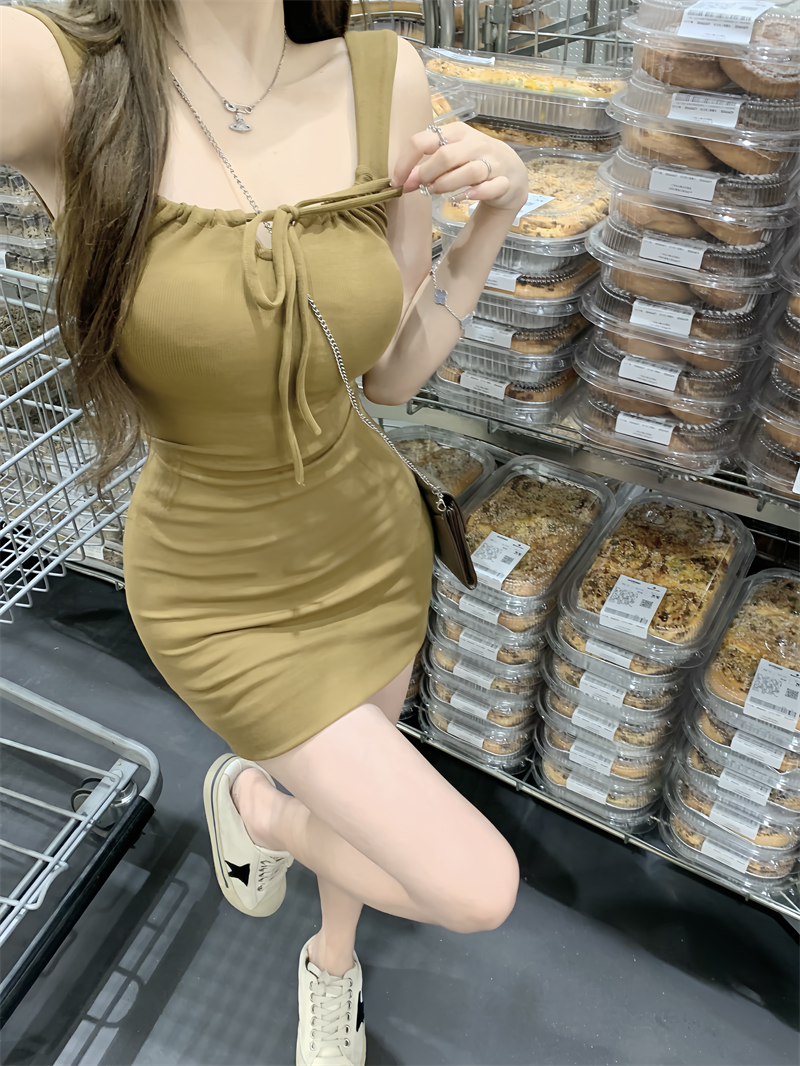 Summer slim fit hip-covering drawstring strappy vest dress