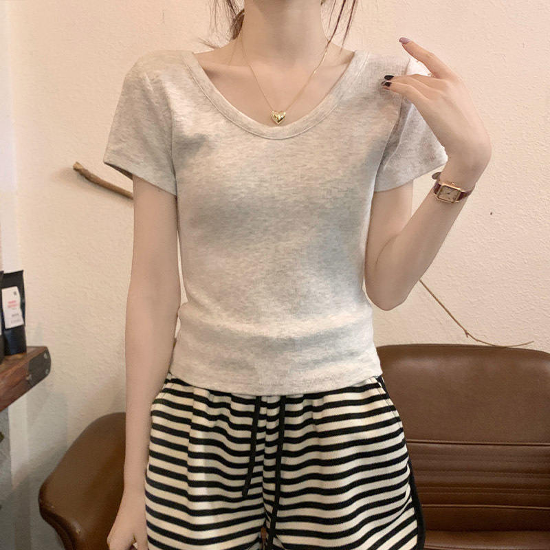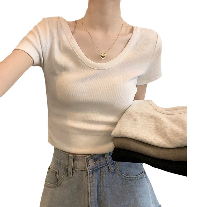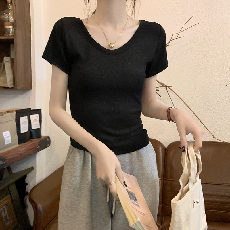 | nameOriginal | Summer Slim Shoulder T-shirt Women's Design Sense Niche V-neck Round Neck Front and Back Solid Color Slim-fit Short-sleeved Top for Women |