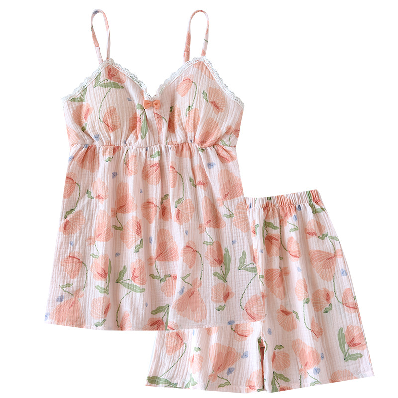 | nameOriginal | Summer Sling Pajamas Set with Chest Pad Women's Flower Short Wrinkled Cloth Double-Layer Yarn Cotton Home Clothes |
