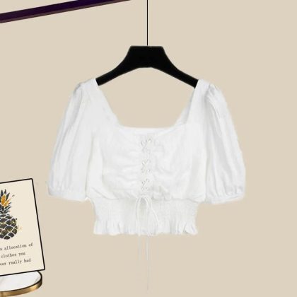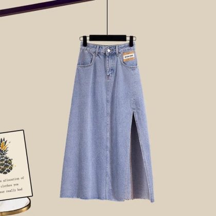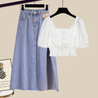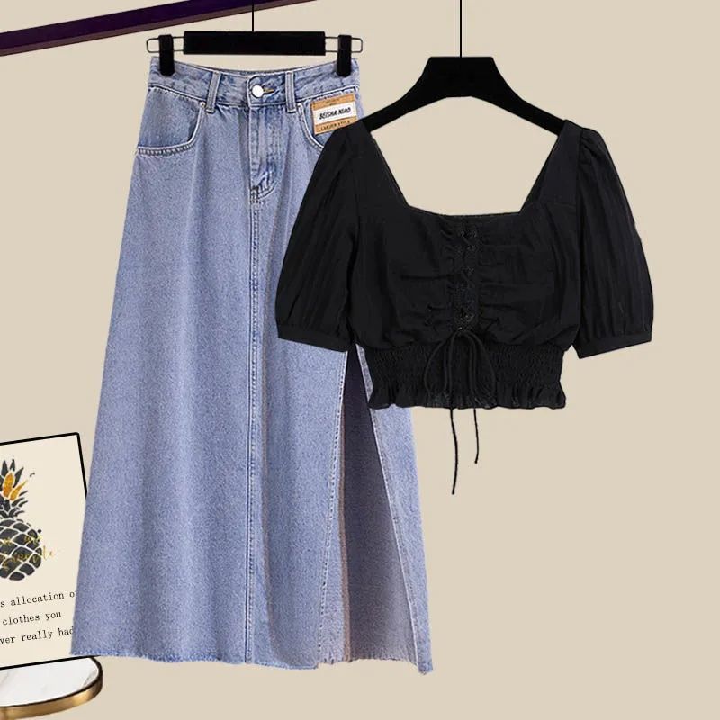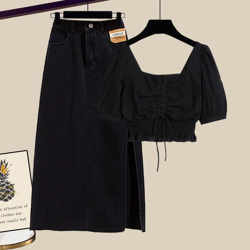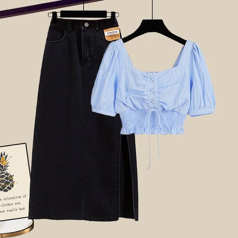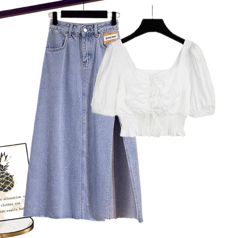 | nameOriginal | Summer suit women's 2022 new plus size women's clothing age-reducing short sleeve shirt high waist Denim skirt two-piece fashion |
