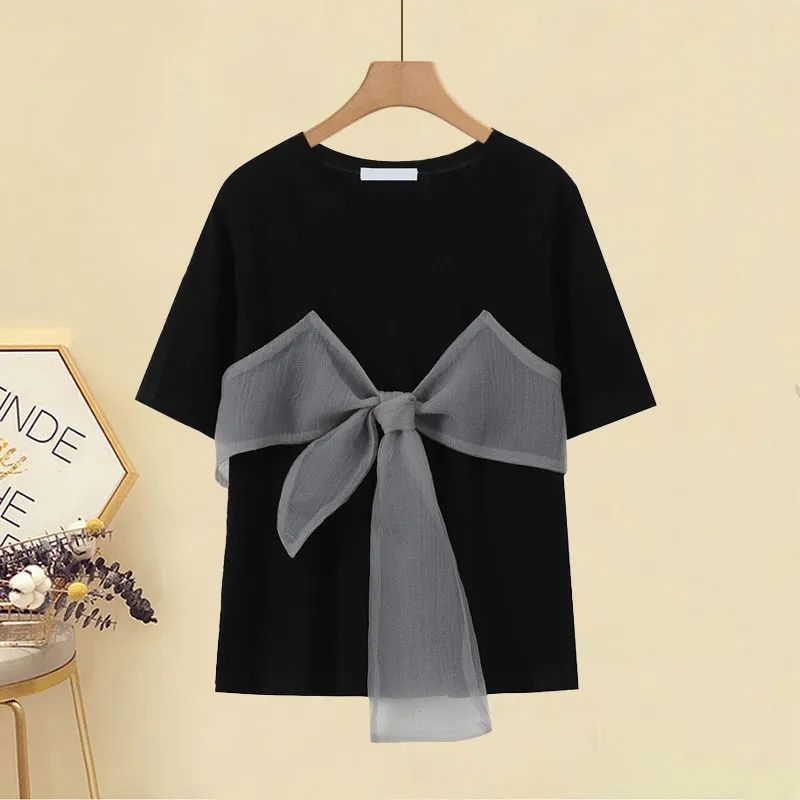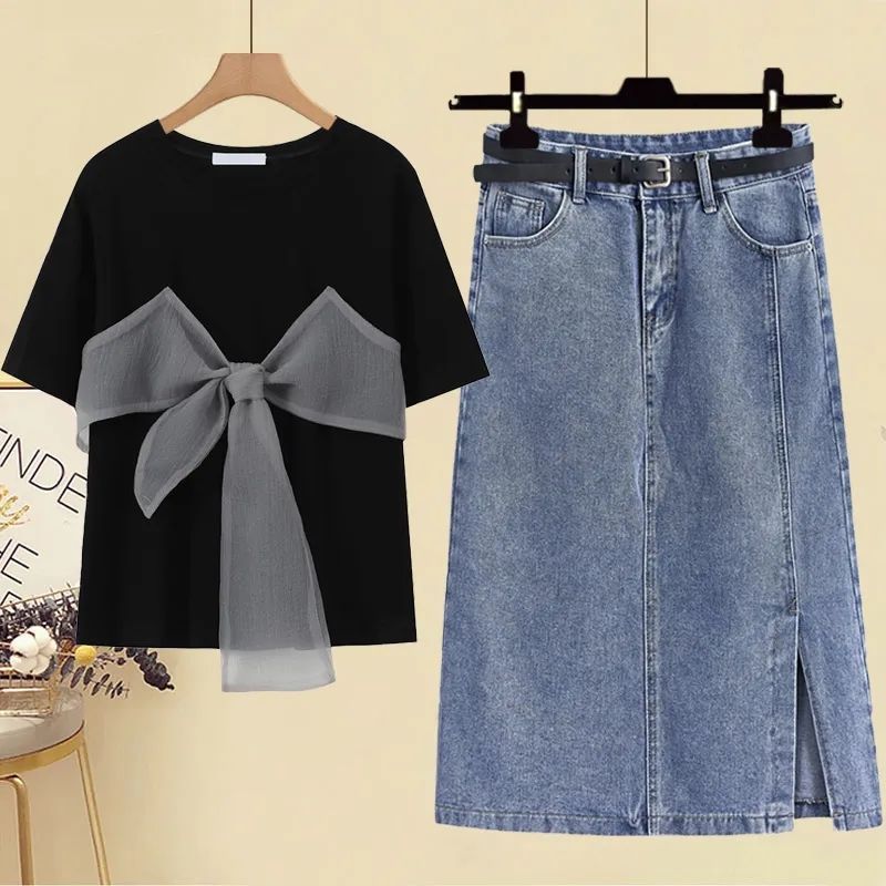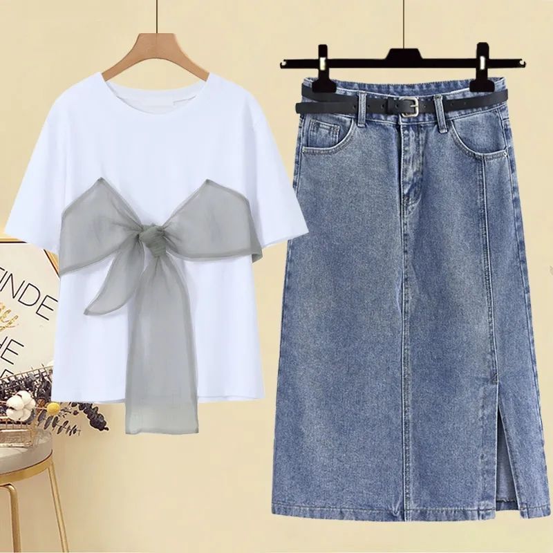 | nameOriginal | Summer suit women's 2024 new fashion foreign-style age-reducing bow T-shirt with high waist Denim skirt suit |