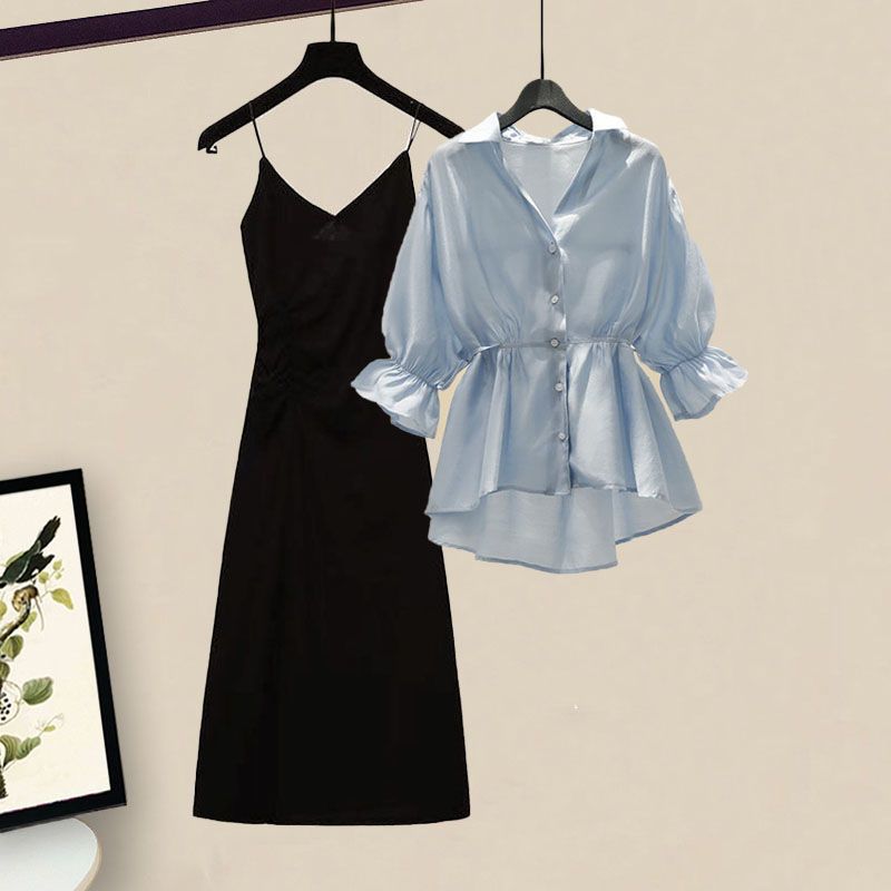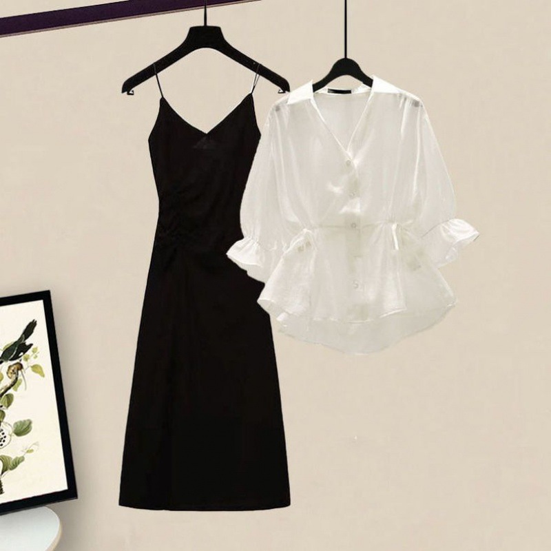 | nameOriginal | Summer suit Women's 2024 New plus size Women's Clothing Tight Waist Slimming Flesh Covering Shirt Sling dress Two-Piece Fashionable Set |