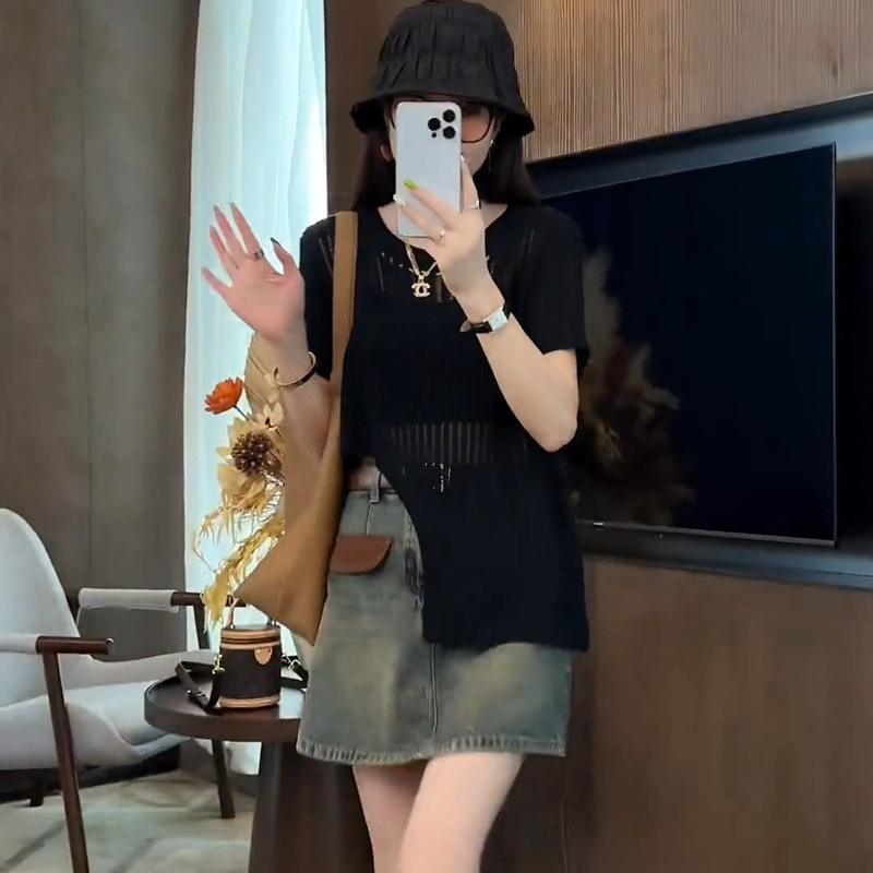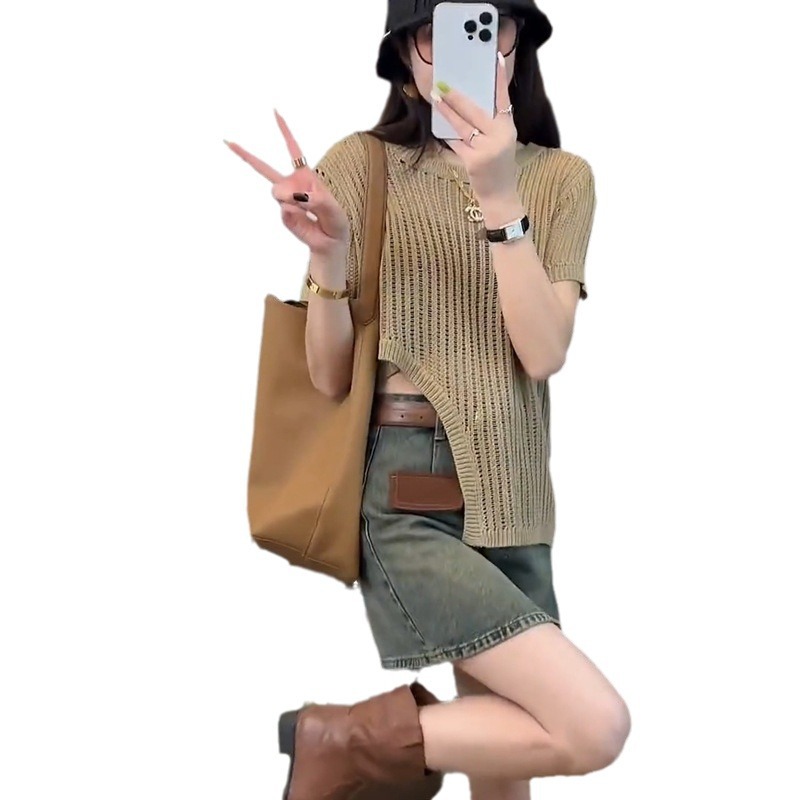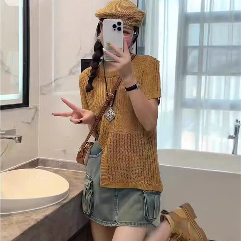 | nameOriginal | Summer Thin Breathable Hollow Knitted Sweater Women's 2024 New Pullover Round Neck Ice Silk Knitted Short-sleeved T-shirt Top |
