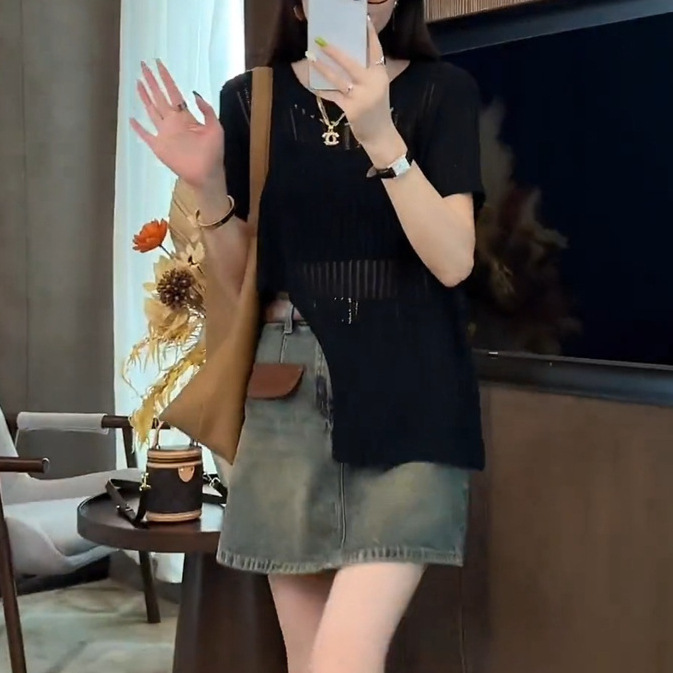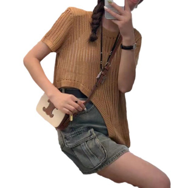 | nameOriginal | Summer Thin Breathable Hollow Knitted Sweater Women's 2024 New Pullover Round Neck Ice Silk Knitted Short-sleeved T-shirt Top |