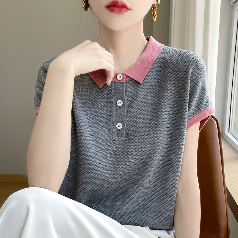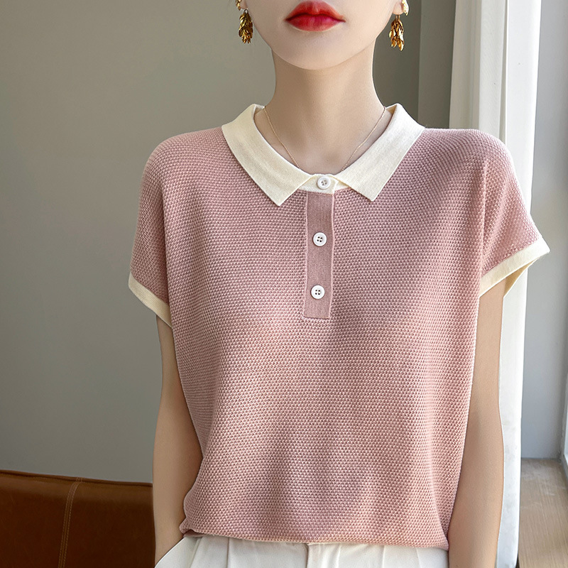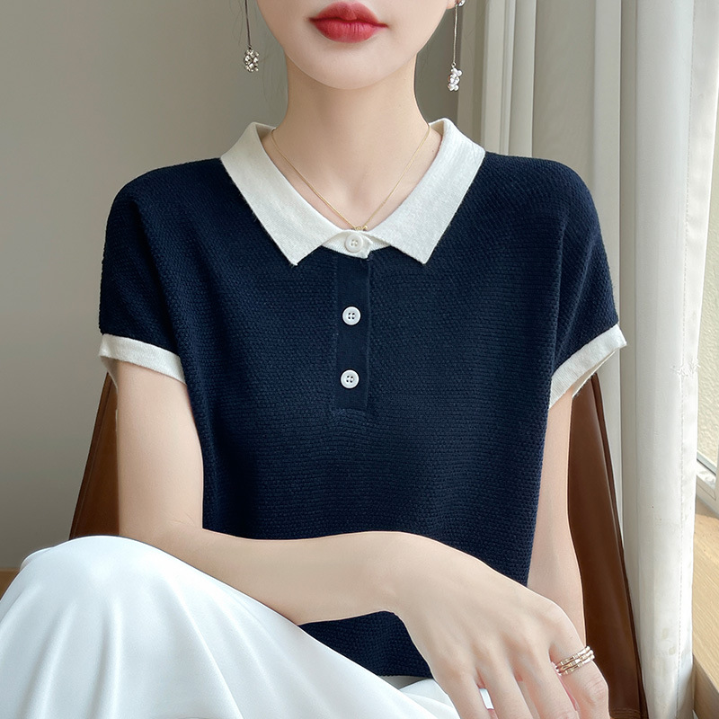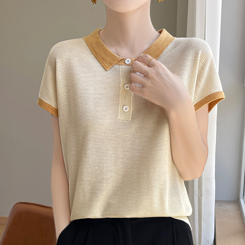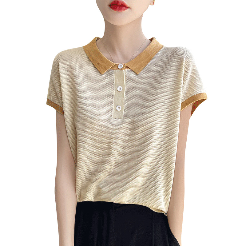 | nameOriginal | Summer Thin Color-block POLO Collar Short-sleeved T-shirt Women's Tencel Knitted Stylish Age-reducing Contrast Color T-shirt Loose Top |