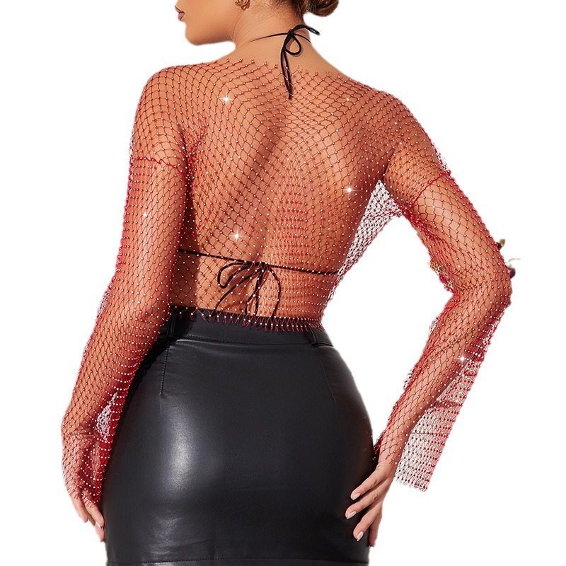 | nameOriginal | Summer Thin Color Diamond Half-cut Top Mesh Diamond Outer Long-sleeved Waistband Party Shirt |