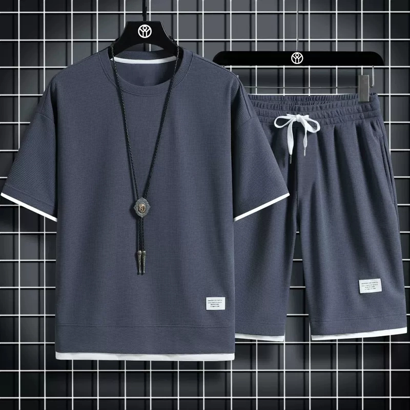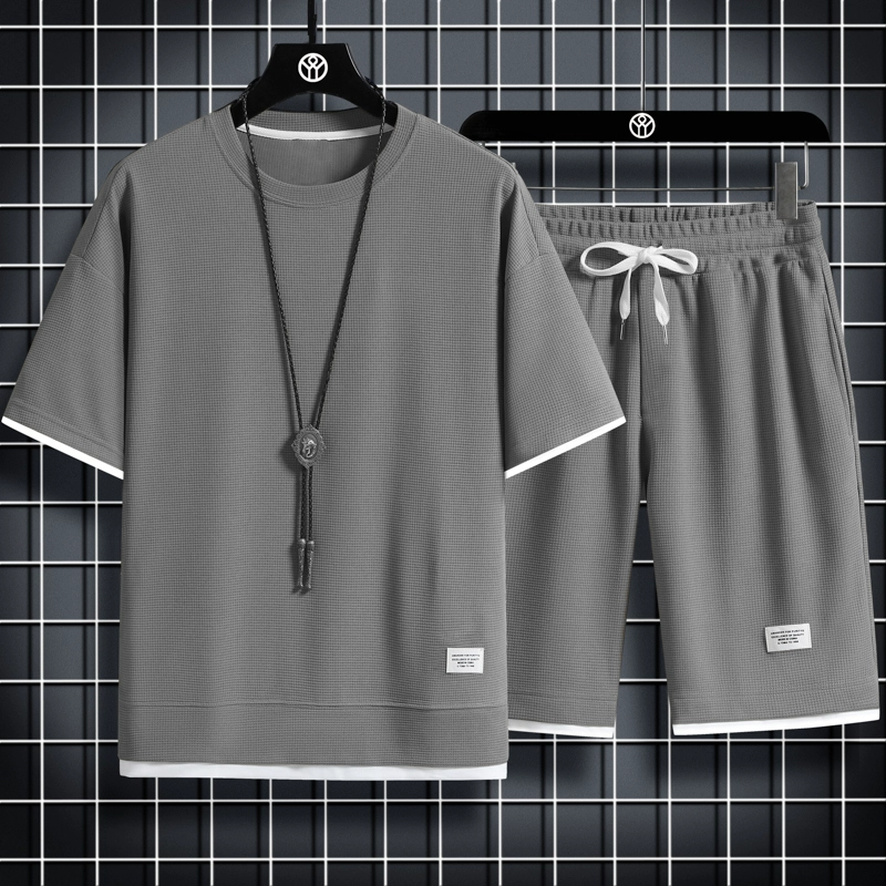Summer thin short-sleeved shorts waffle men’s loose casual sports summer two-piece home clothes suit black