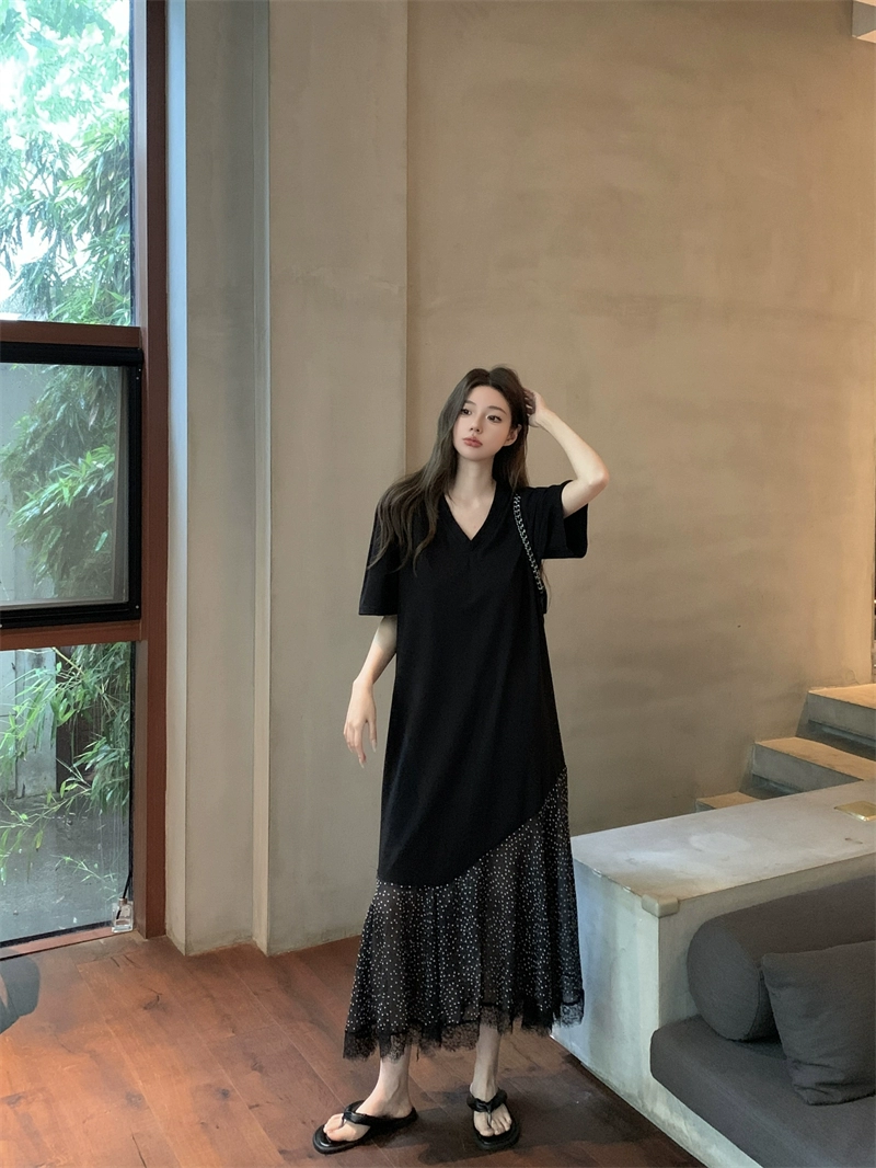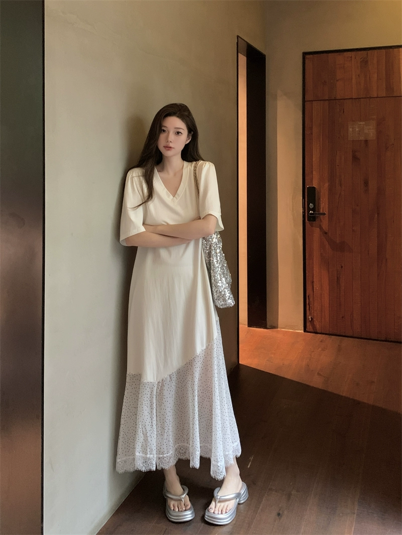 | nameOriginal | Summer v-neck loose lace polka dot long skirt with short sleeves |