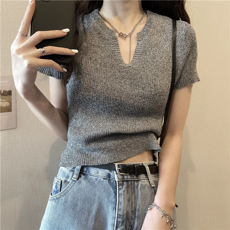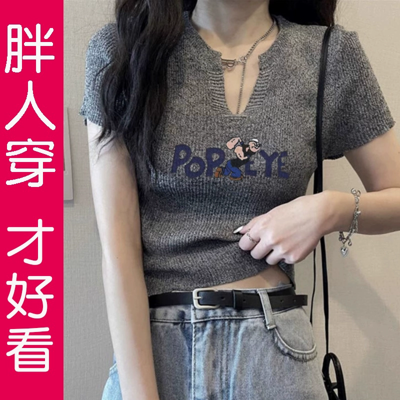 Summer V -neck Positive Shoulder Loose Fat MM Top Short -sleeved T -shirt