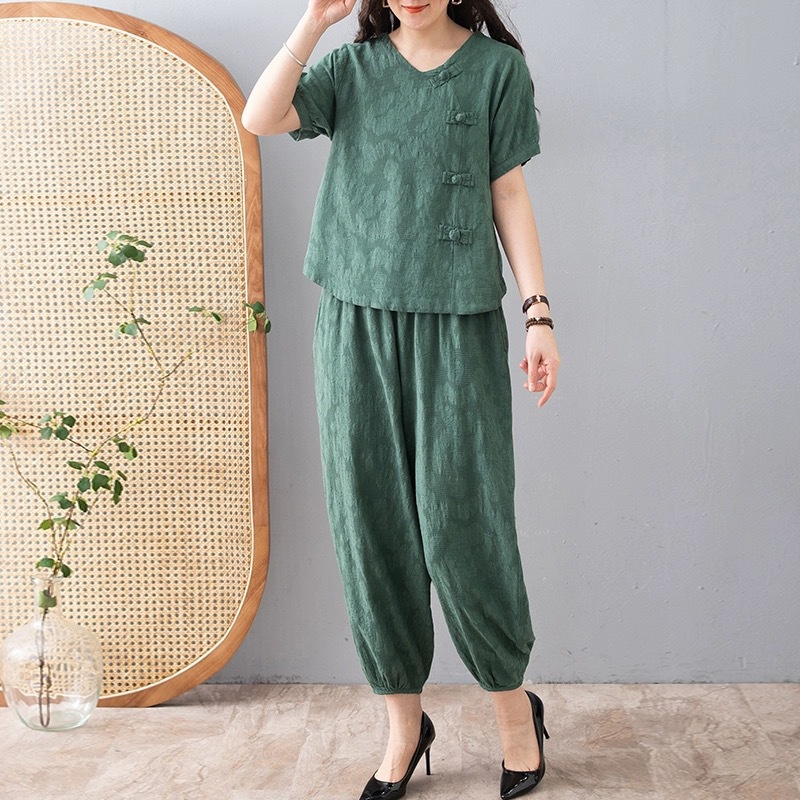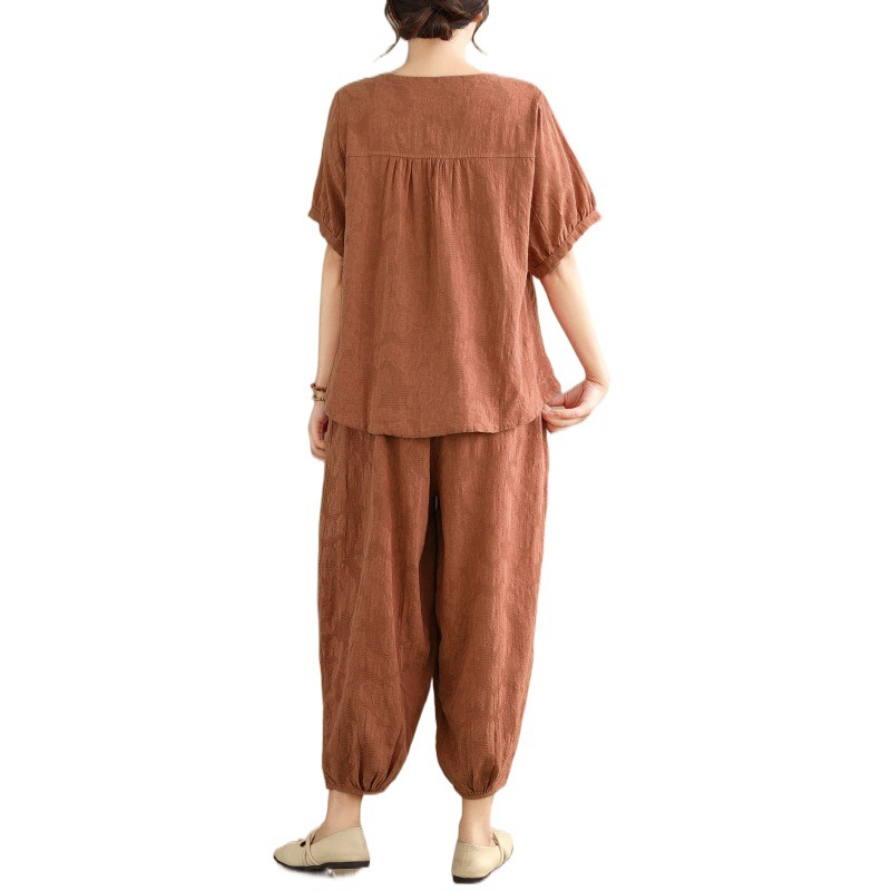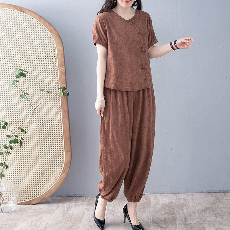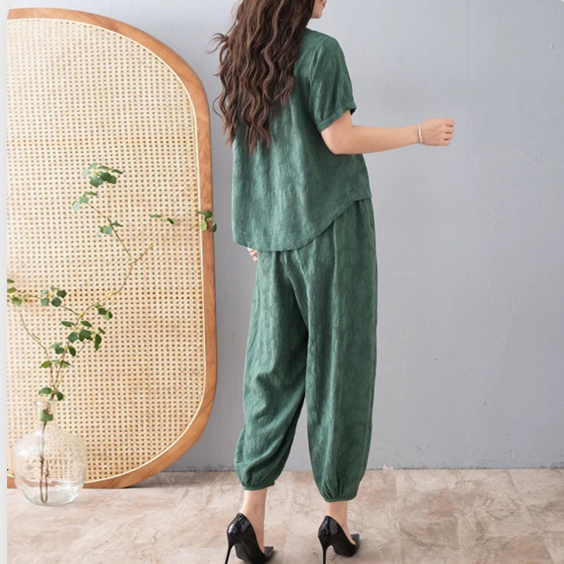 | nameOriginal | Summer Vintage Fashion Cotton Linen Jacquard Set Women's Loose Slimming Casual Short-sleeved Women's Top Bloomer Pants Two-piece Set |