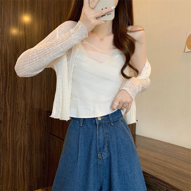 Summer wear a whole suit of women’s Korean-style niche long-sleeved knitted sunscreen cardigan camisole top two-piece set