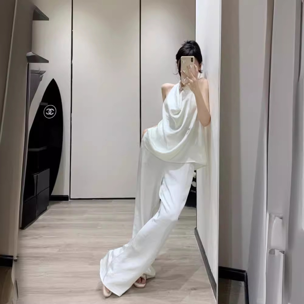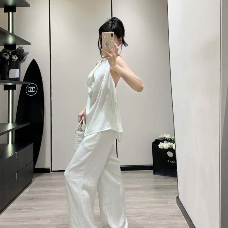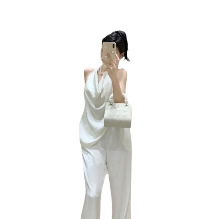Summer wear with a set of this year’s fashion relaxed streamer back hanging neck vest wide leg pants two-piece women