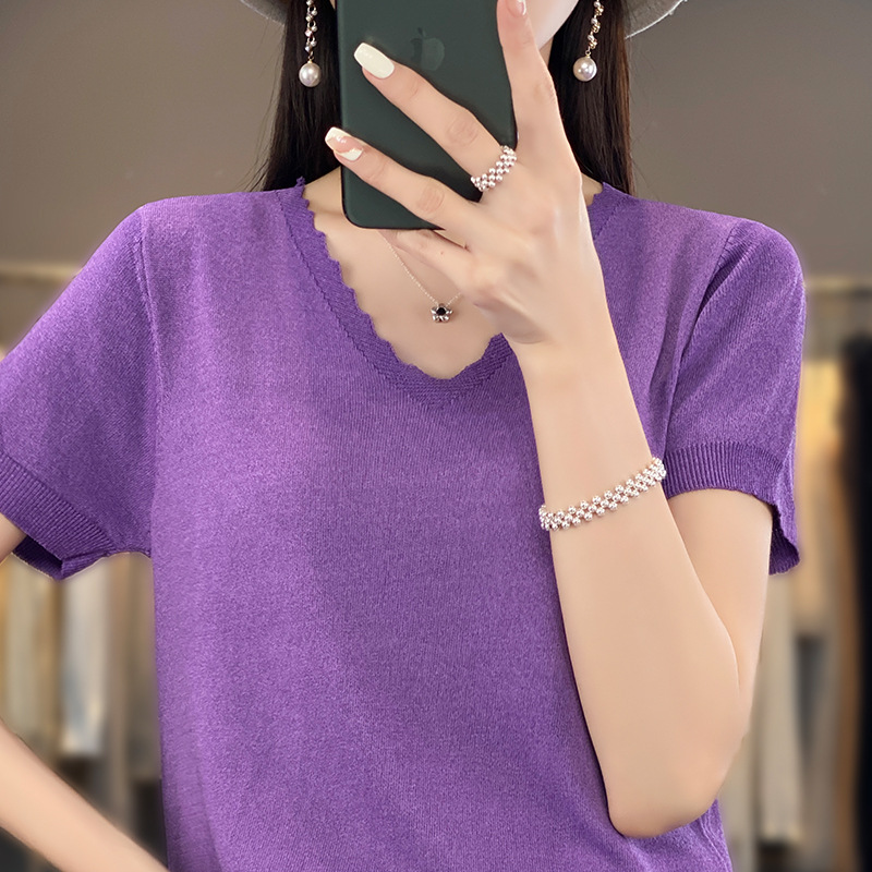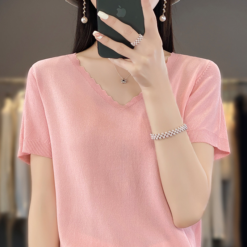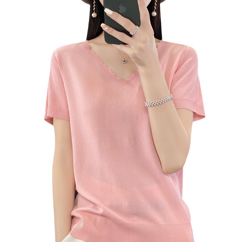 | nameOriginal | Summer women's quzhu ice silk short sleeve women's thin sweater T-shirt women's lace V collar Korean foreign trade factory wholesale generation |