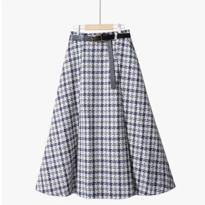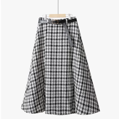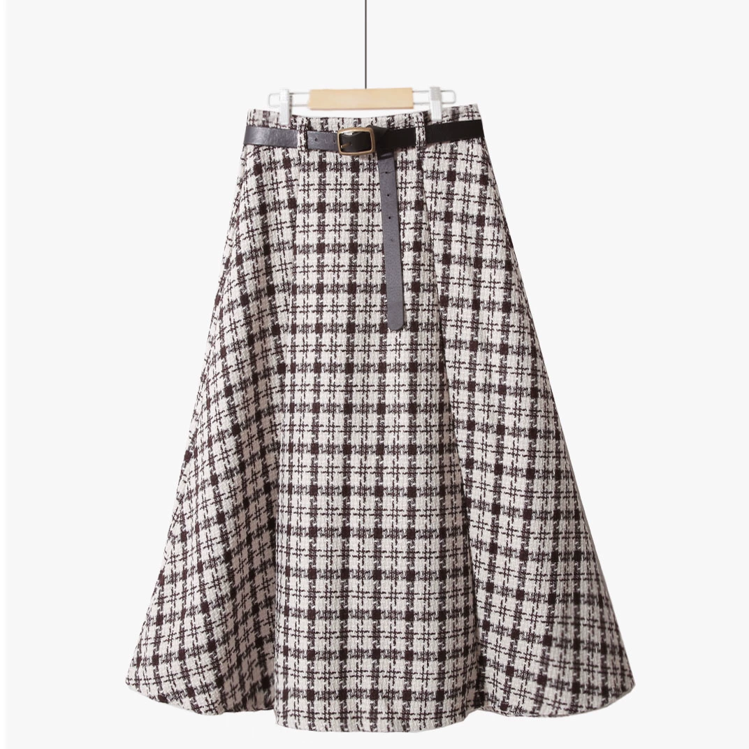 Summer's new retro-style high-waisted, slimming, wide-slung A-line skirt that covers the crotch, umbrella skirt, woolen plaid mid-length skirt
