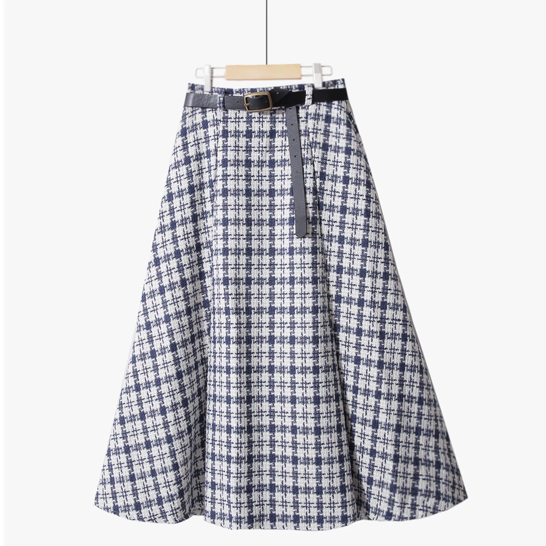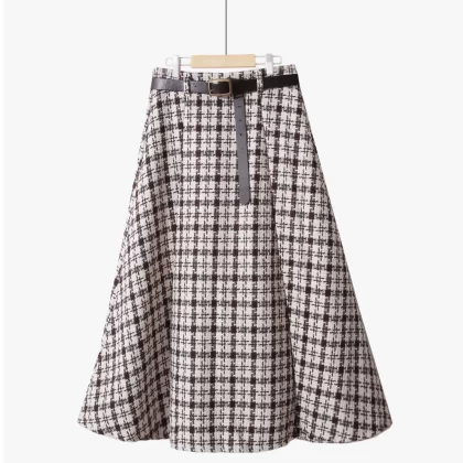 Summer’s new retro-style high-waisted, slimming, wide-slung A-line skirt that covers the crotch, umbrella skirt, woolen plaid mid-length skirt