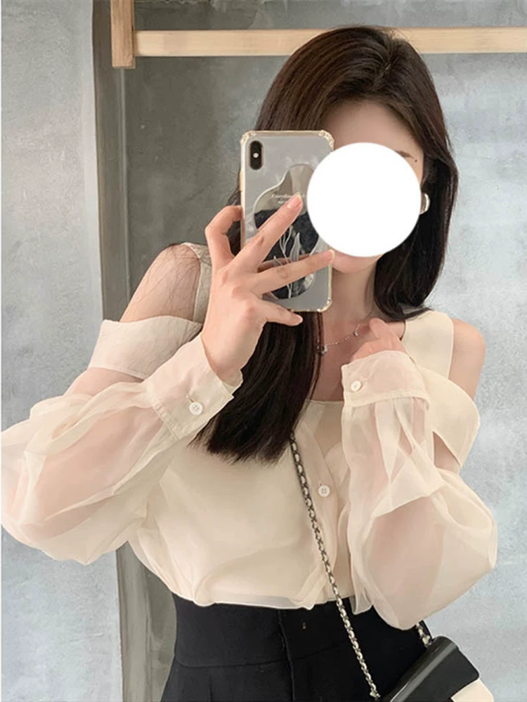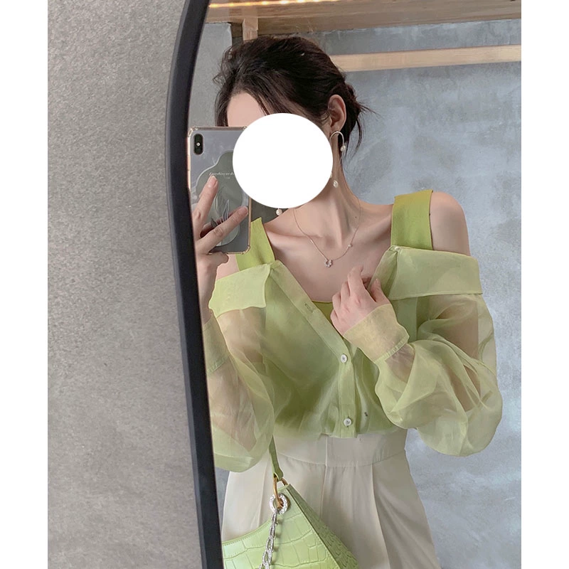 | nameOriginal | Sun protection green vest spliced fake two-piece shirt for women petite summer design niche long-sleeved mesh top |