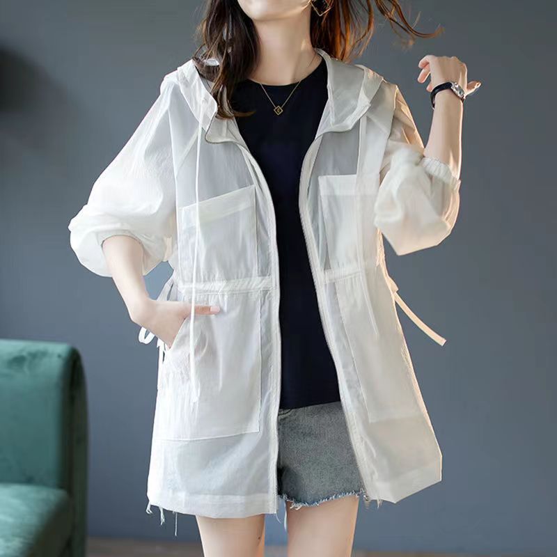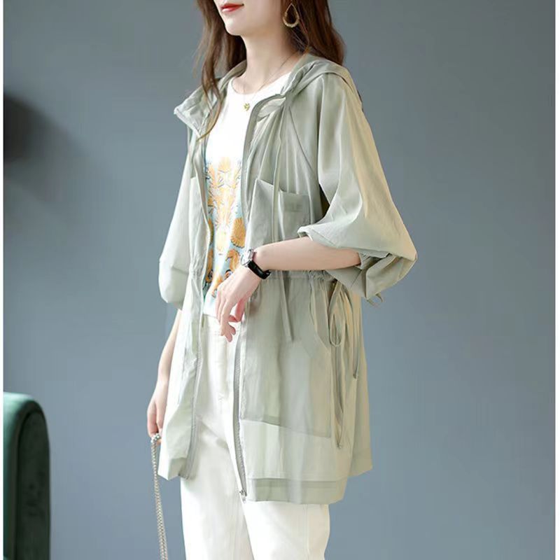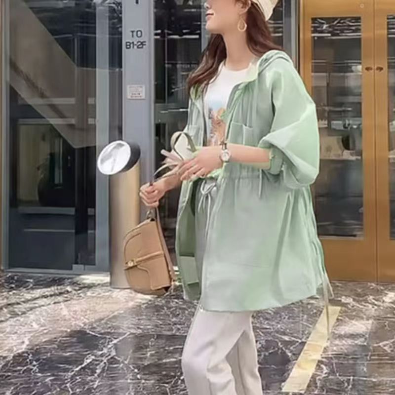 Sun-protective Clothing Women's 2024 New Drawstring Tight Waist Mid-length Long-sleeved Thin Windbreaker UV-resistant Cardigan Outer Wear Coat