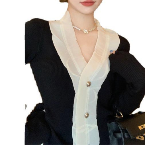 Super fairy elegant socialite V-neck lace long-sleeved sweater women’s French Chanel style pure tea art Top Autumn