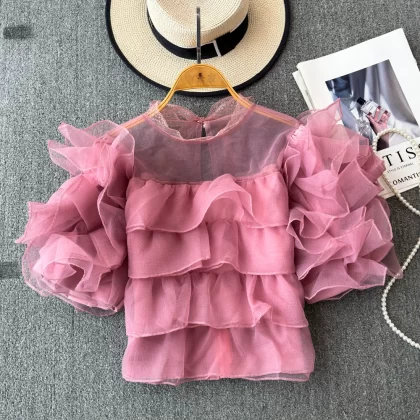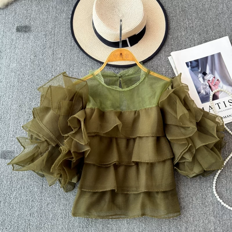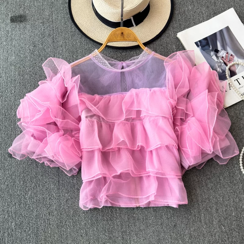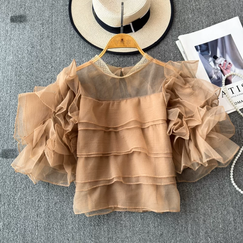 nameOriginal | Super fairy mesh ruffled puff sleeve shirt for women summer new style unique design trendy chiffon shirt |