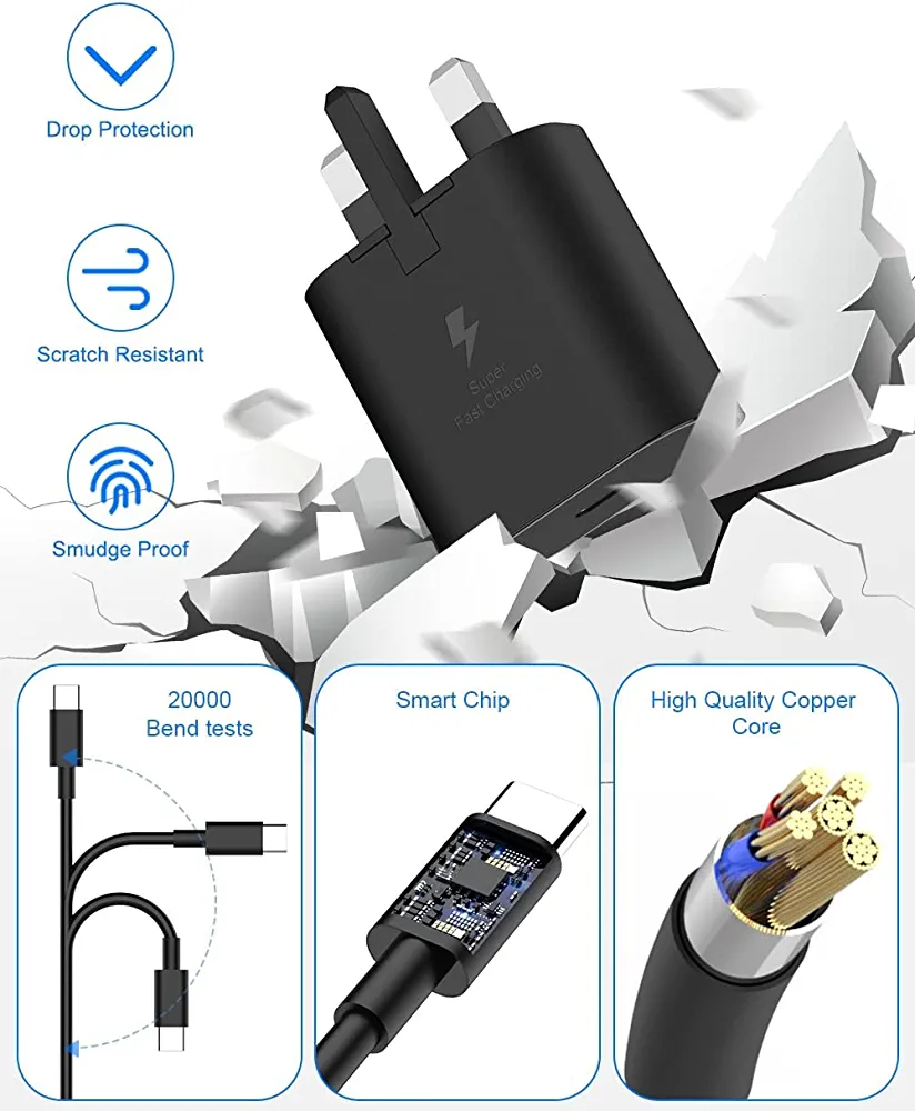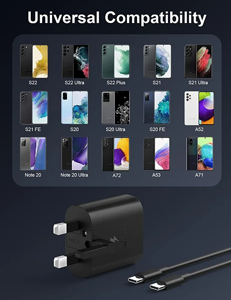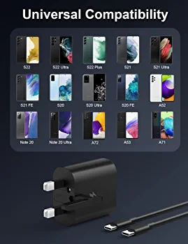 | nameOriginal | 25W USB C Charger Replacement for Samsung Galaxy S23/S23 Ultra/S22/S22+/S21/S21 FE/A73/A23/A33/A53/Z Flip 4/Z Fold 4, Type C PD3.0 & PPS Super Fast Charger Plug with 1.5m Charging Cable |