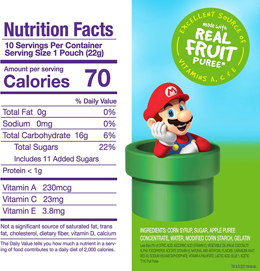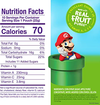 | nameOriginal | Funables Fruit Snacks, Super Mario Shaped Fruit Flavored Snacks, Pack of 10 0.8 ounce Pouches |