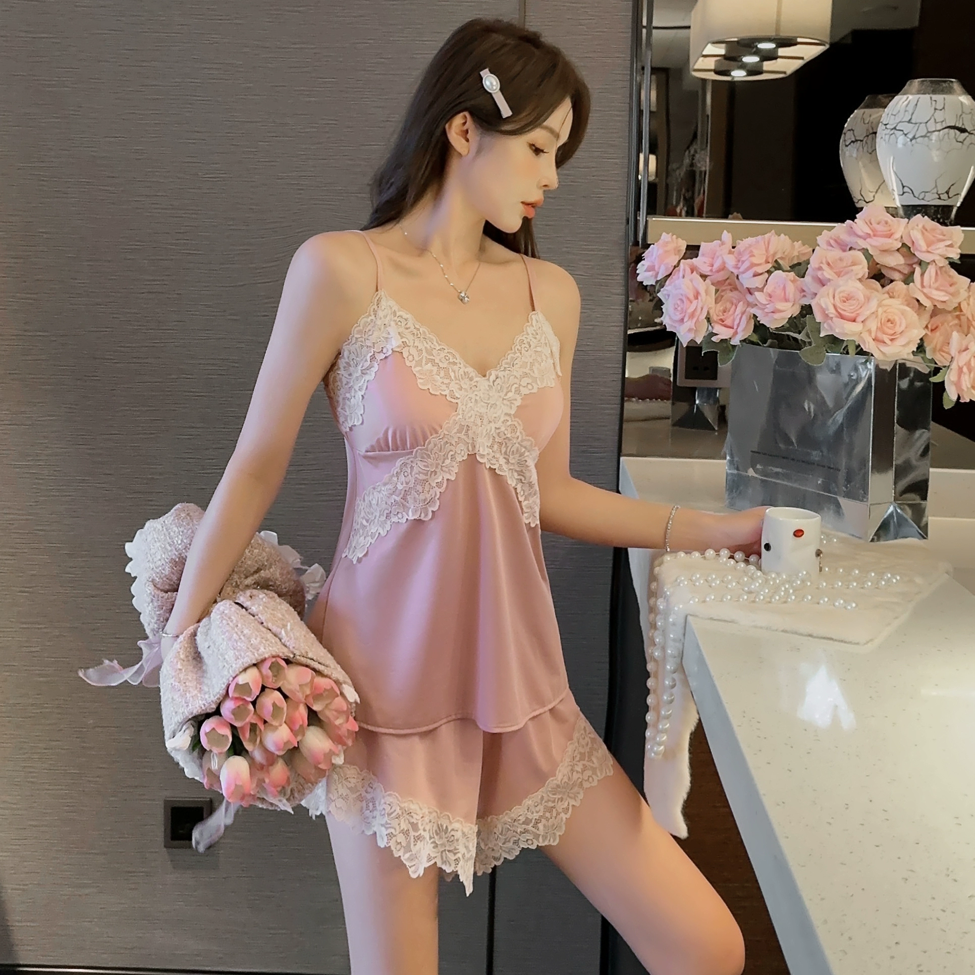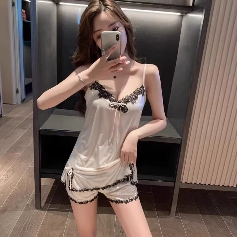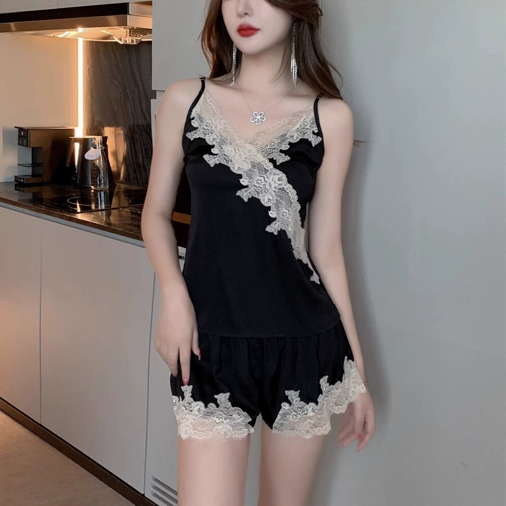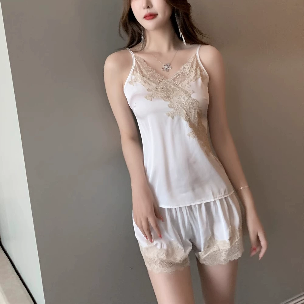 | nameOriginal | Suspender pajamas for women summer with chest pad ice silk 2024 new lace hollow shorts sexy home wear set |