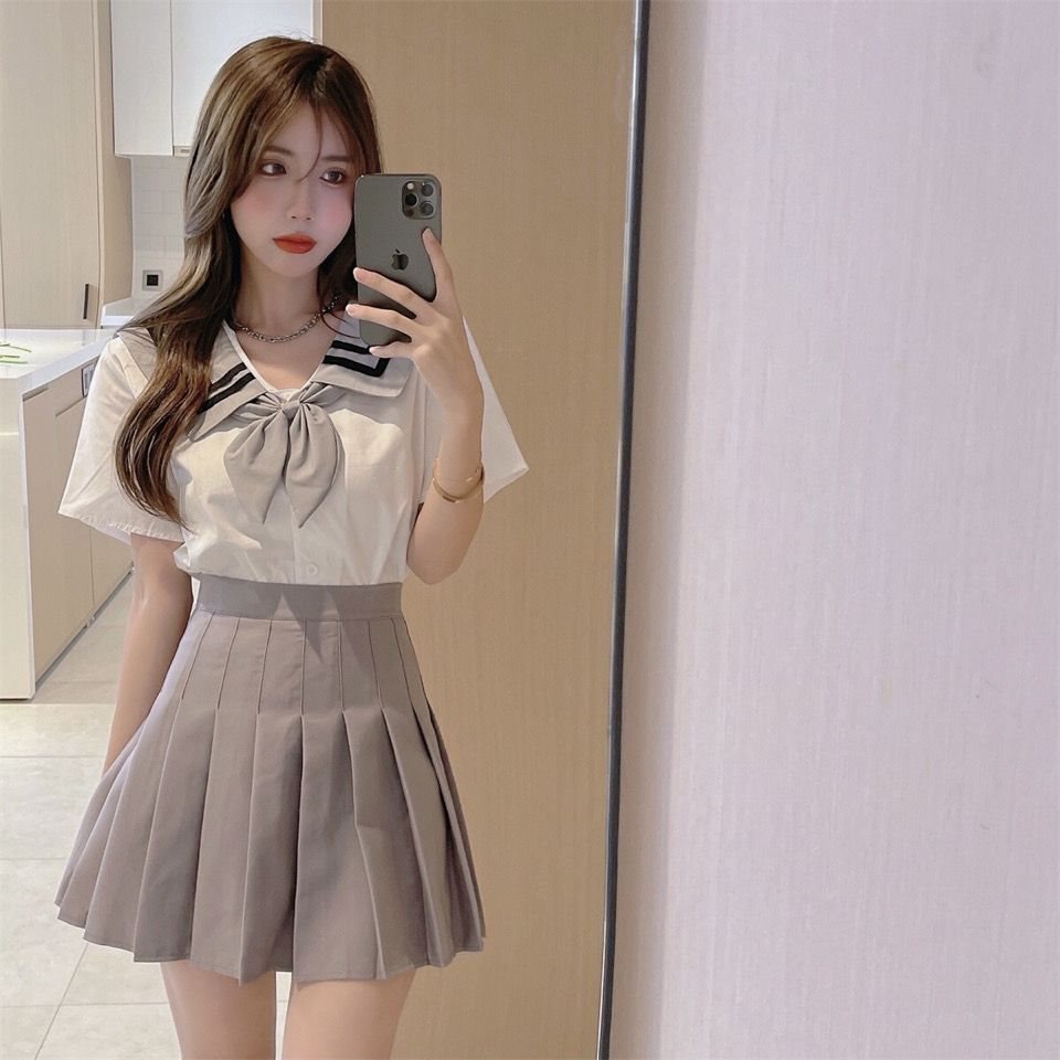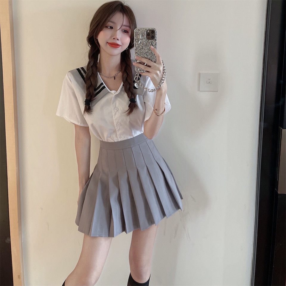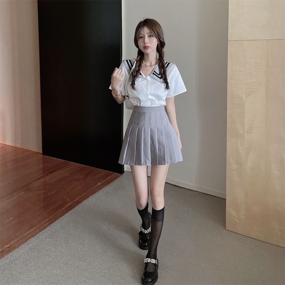 | nameOriginal | Sweet Academy Style Navy Collar Two-Piece Set Women's Summer JK Uniform Short Sleeve Shirt High Waist Pleated Skirt suit |
