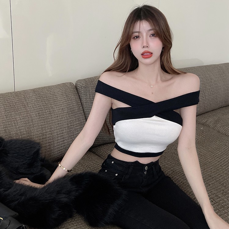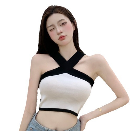 | nameOriginal | Sweet and Fresh Cross Neck Short Navel Black and White Color-matching Knitted Camisole Shirt Women's Pure Shoulder Stylike Vest |
