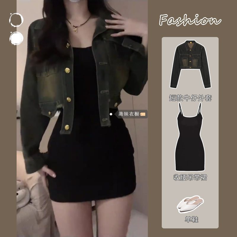 | nameOriginal | Sweet and Hot Style Short Denim Coat Two-piece Suit Women's Autumn Black Hip Sling dress Outer Long-sleeved Top |