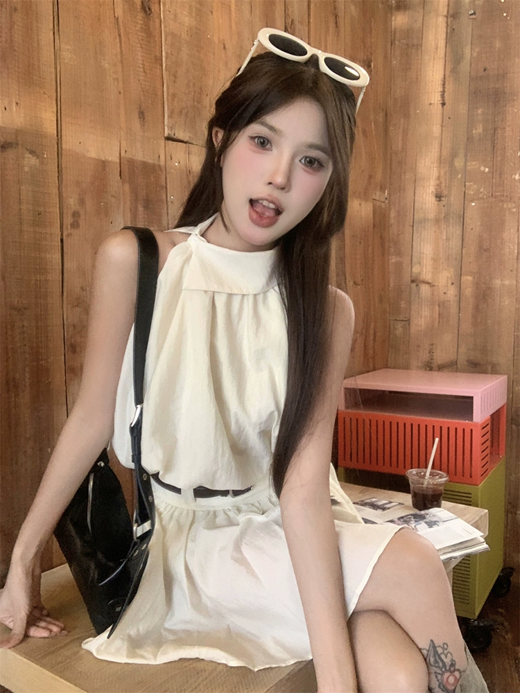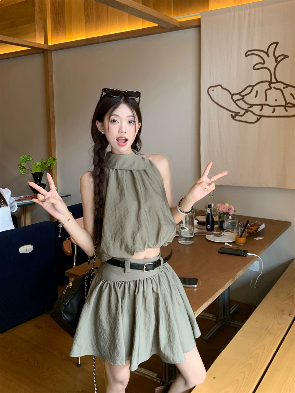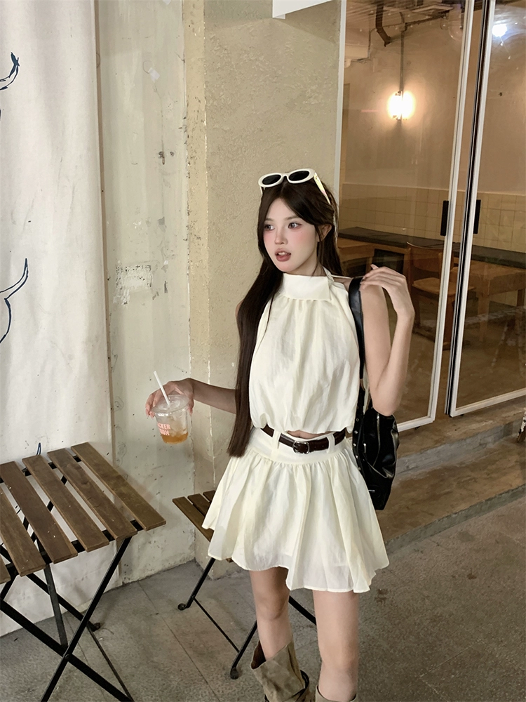 Sweet and Salty Sleeveless Shirt Pleated Skirt Halter Neck