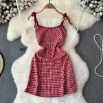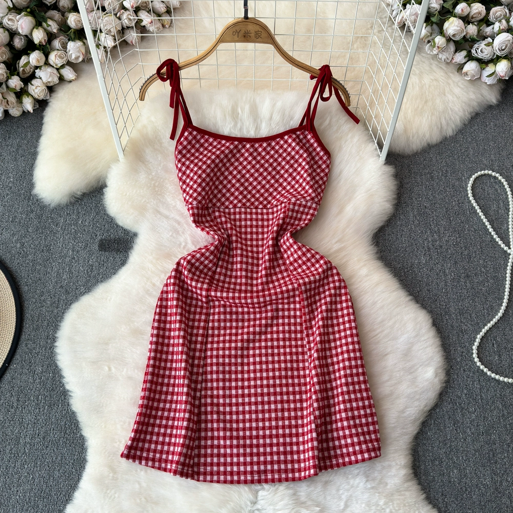 Sweet and Spicy Holiday Style Suspender Dress 2024 New Summer Little Red Plaid Backless A-Line Bottoming Skirt