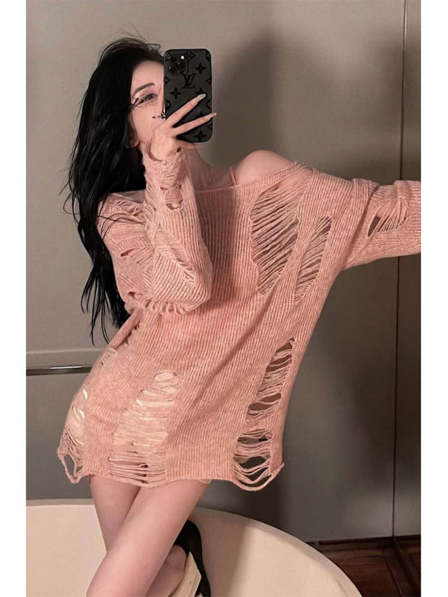 | nameOriginal | Sweet and spicy pink ripped Korean mid-length sweater |