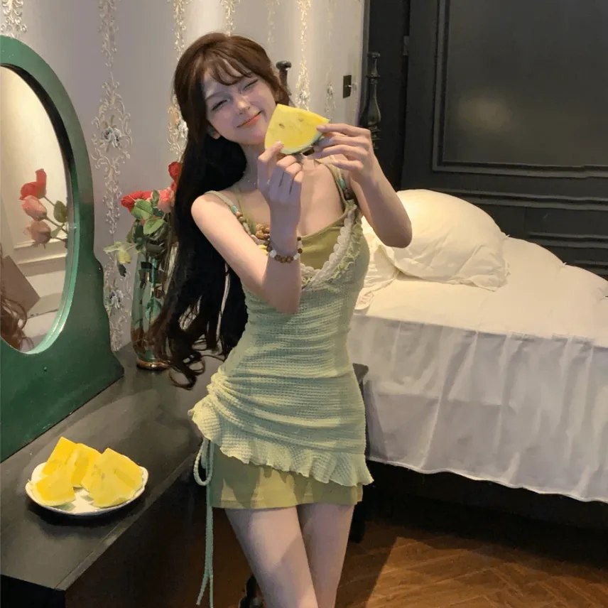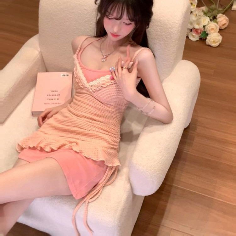 Sweet and Spicy Pure Style Irregular Sling dress Women’s Summer Girl’s Lace Lace Drawstring Stacked Two-piece Set