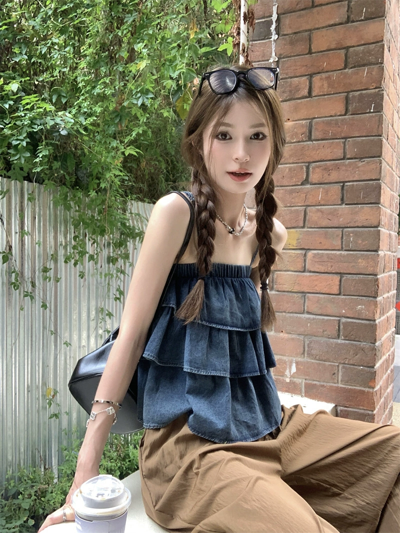 Sweet and Spicy Ruffled Denim Draped Casual Pants Suspenders