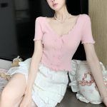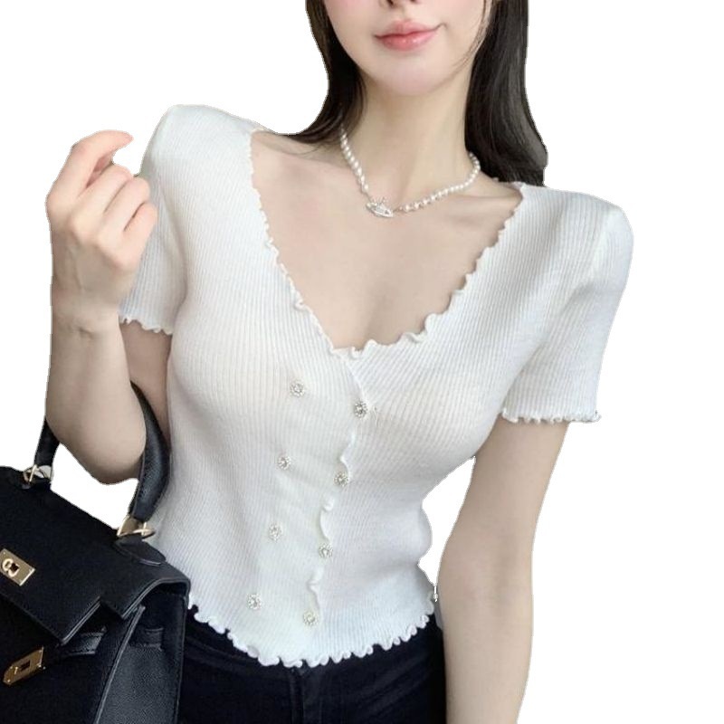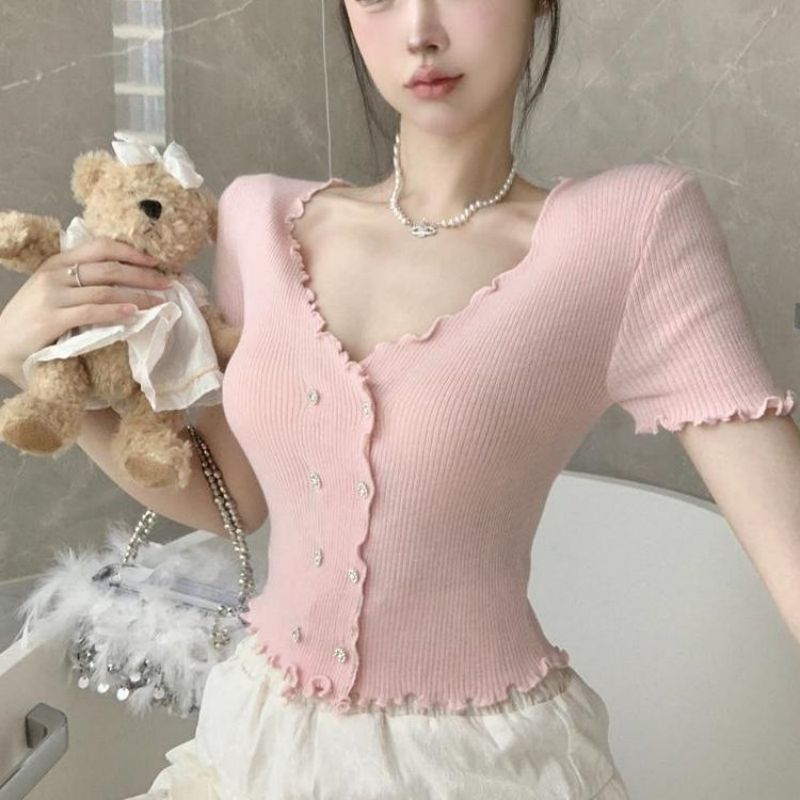 | nameOriginal | Sweet and Spicy Style V-neck Ear Edge Double-breasted Short Slim-fit Short-sleeved Sweater Women's Summer Korean Style Chanel Style Top for Women |