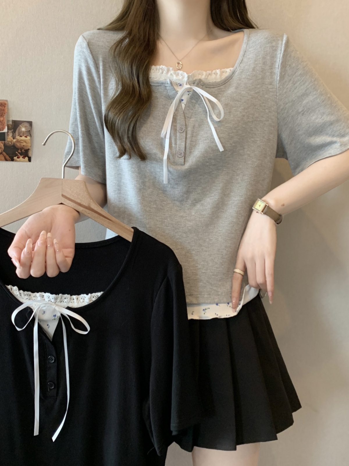 | nameOriginal | Sweet and spicy summer slimming right shoulder lace short-sleeved T-shirt |