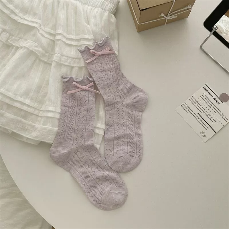 | nameOriginal | Sweet and versatile summer new high elastic cotton fungus heart hollow macaron color bow thin socks |