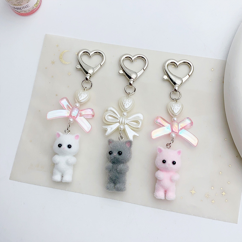 Sweet Cool Y2K Girl's Heart Cute Flocking Kitten Bow Love Keychain Joker Bag Pendant Exquisite Women