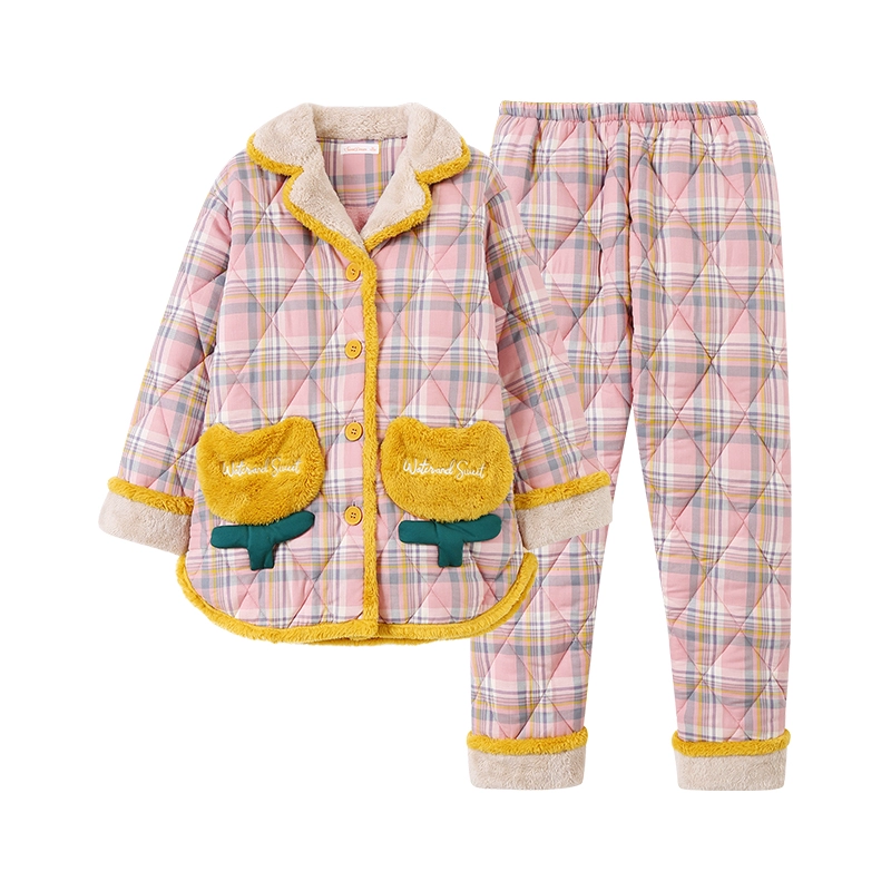 Sweet dream winter cute girls’ velvet thickened quilted pajamas three-layer cotton jacket plaid home clothes autumn and winter set