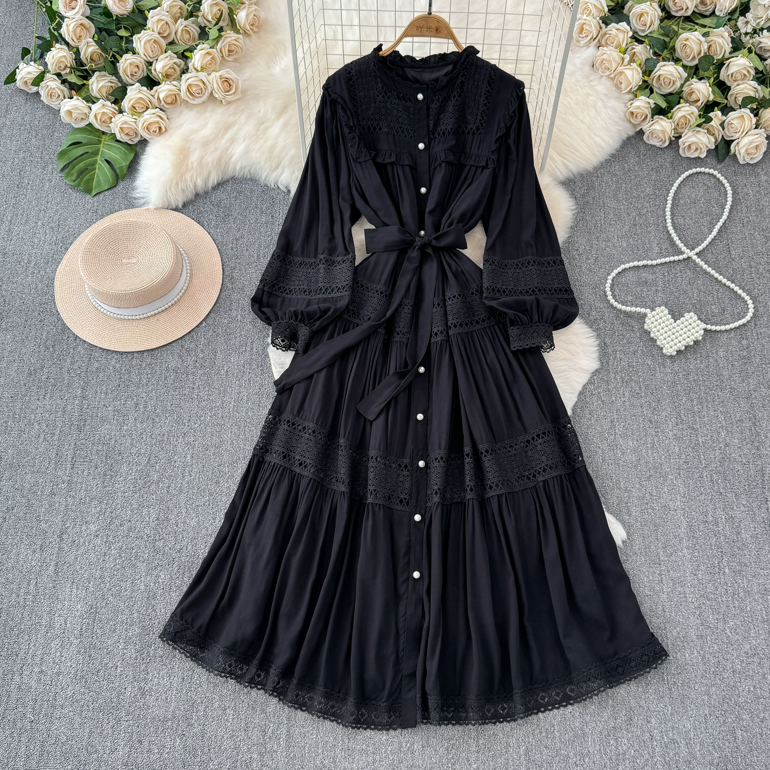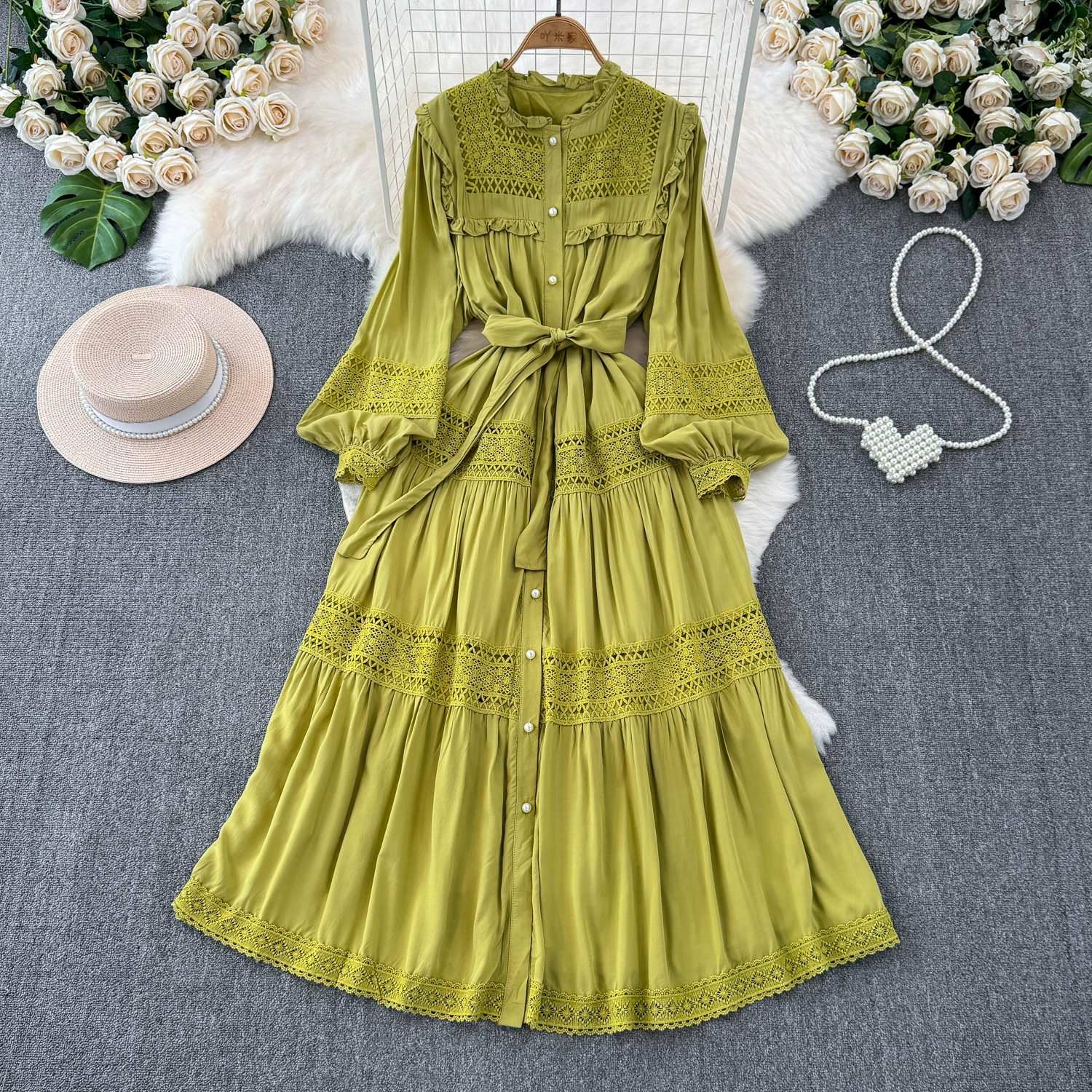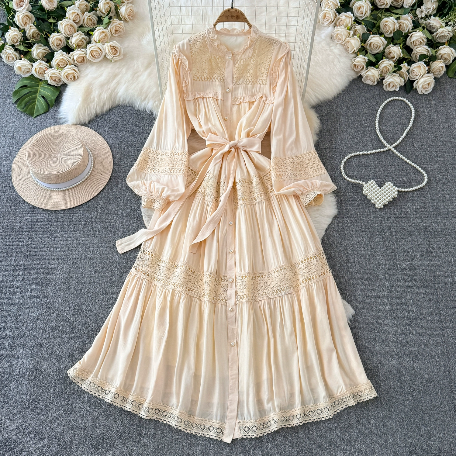 Sweet fungus edge collar buttoned lace-up slim long hollow lace splicing French puff sleeve dress for women spring