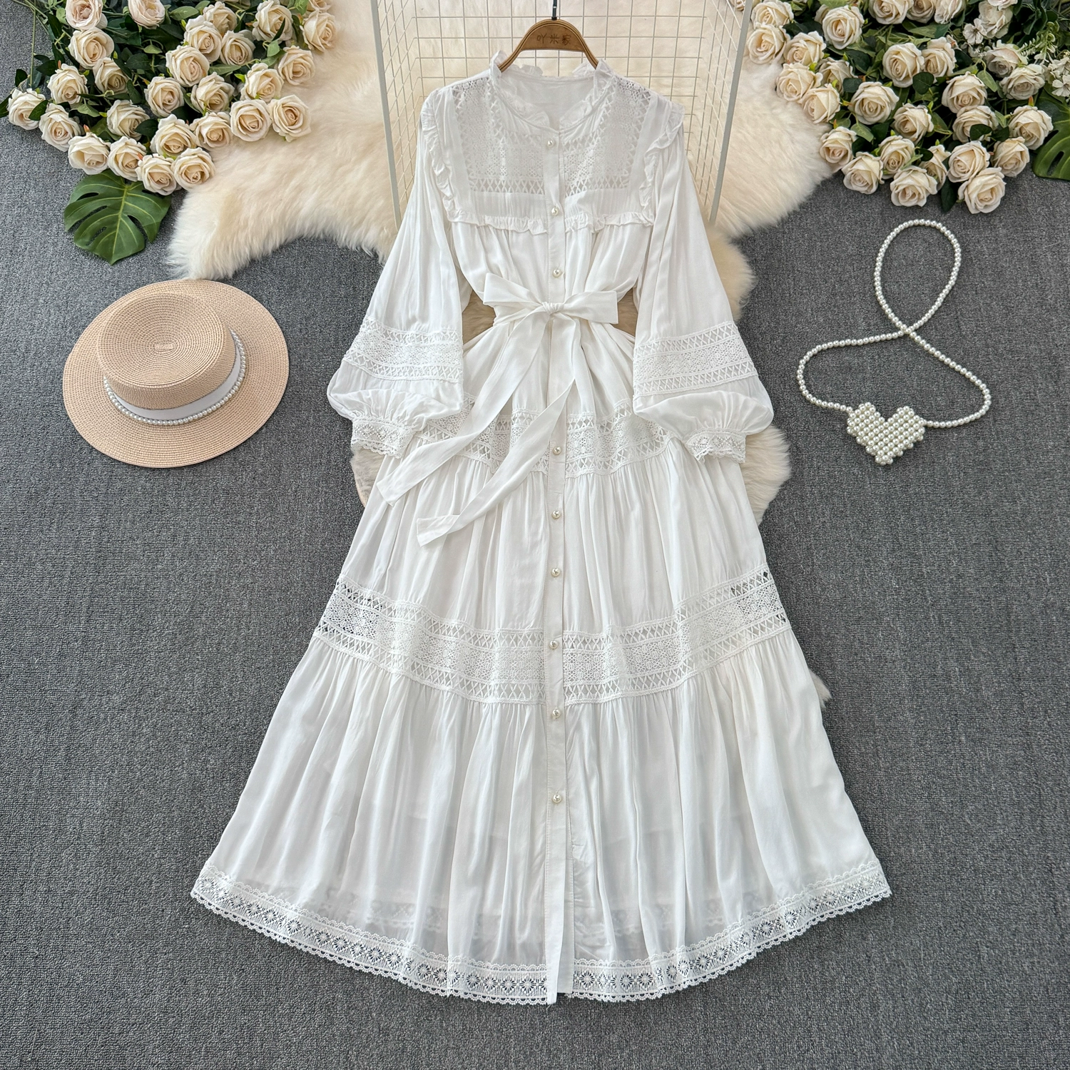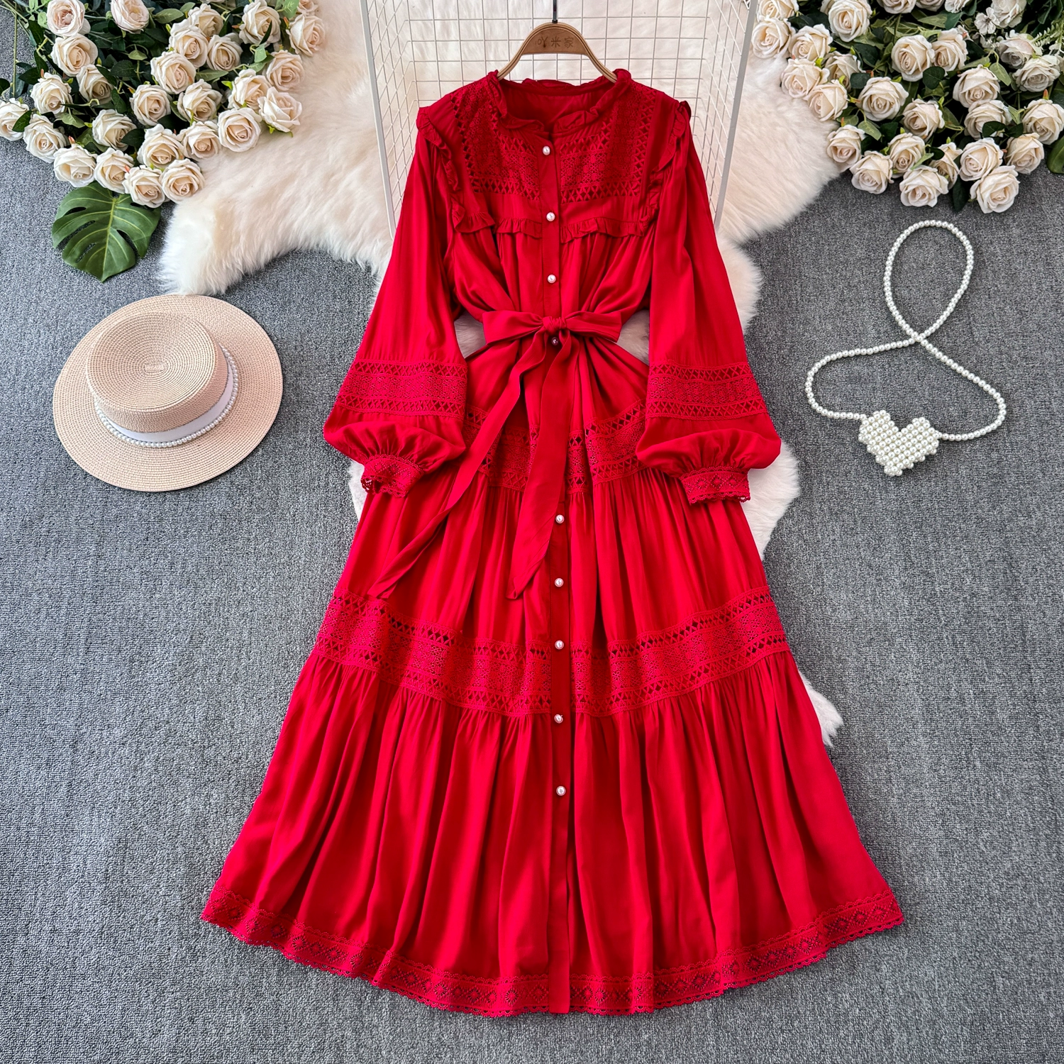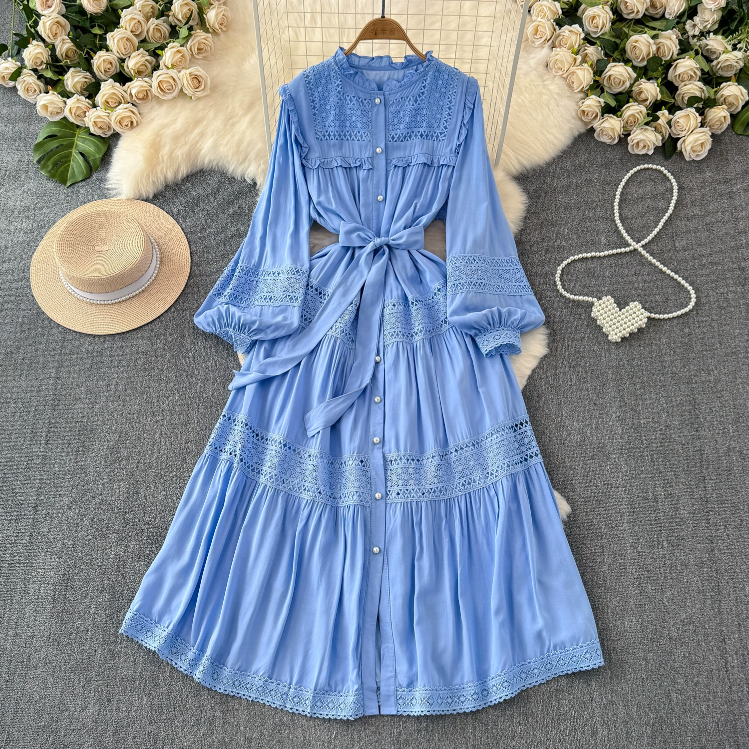 Sweet fungus edge collar buttoned lace-up slim long hollow lace splicing French puff sleeve dress for women spring