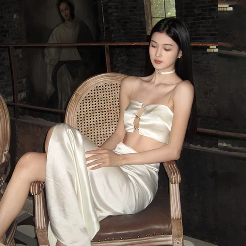 Sweet girl's one-line collar skirt suit Sanya tube top