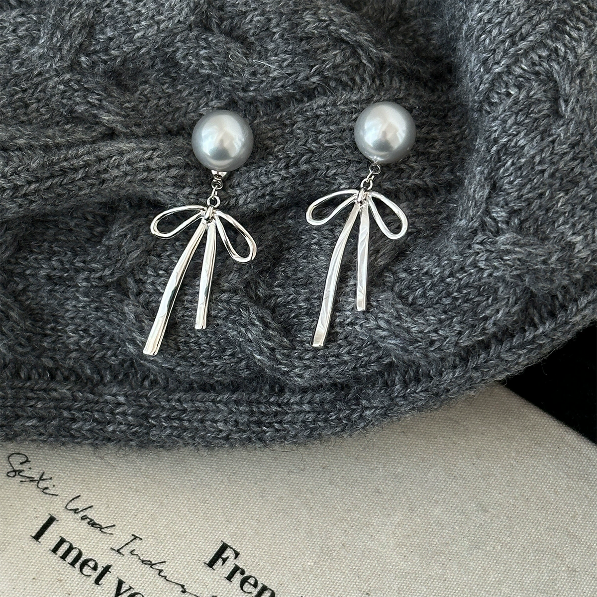 Sweet Gray Pearl Stud Earrings for Women Simple Line Bow Temperament S925 Silver Needle Studs Versatile Elegant Earrings